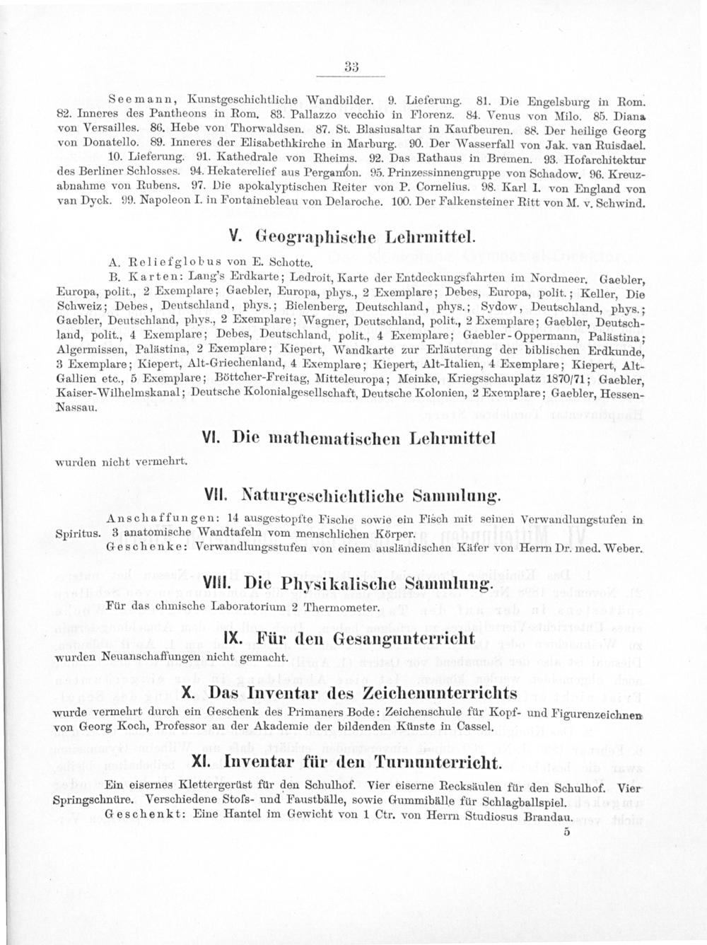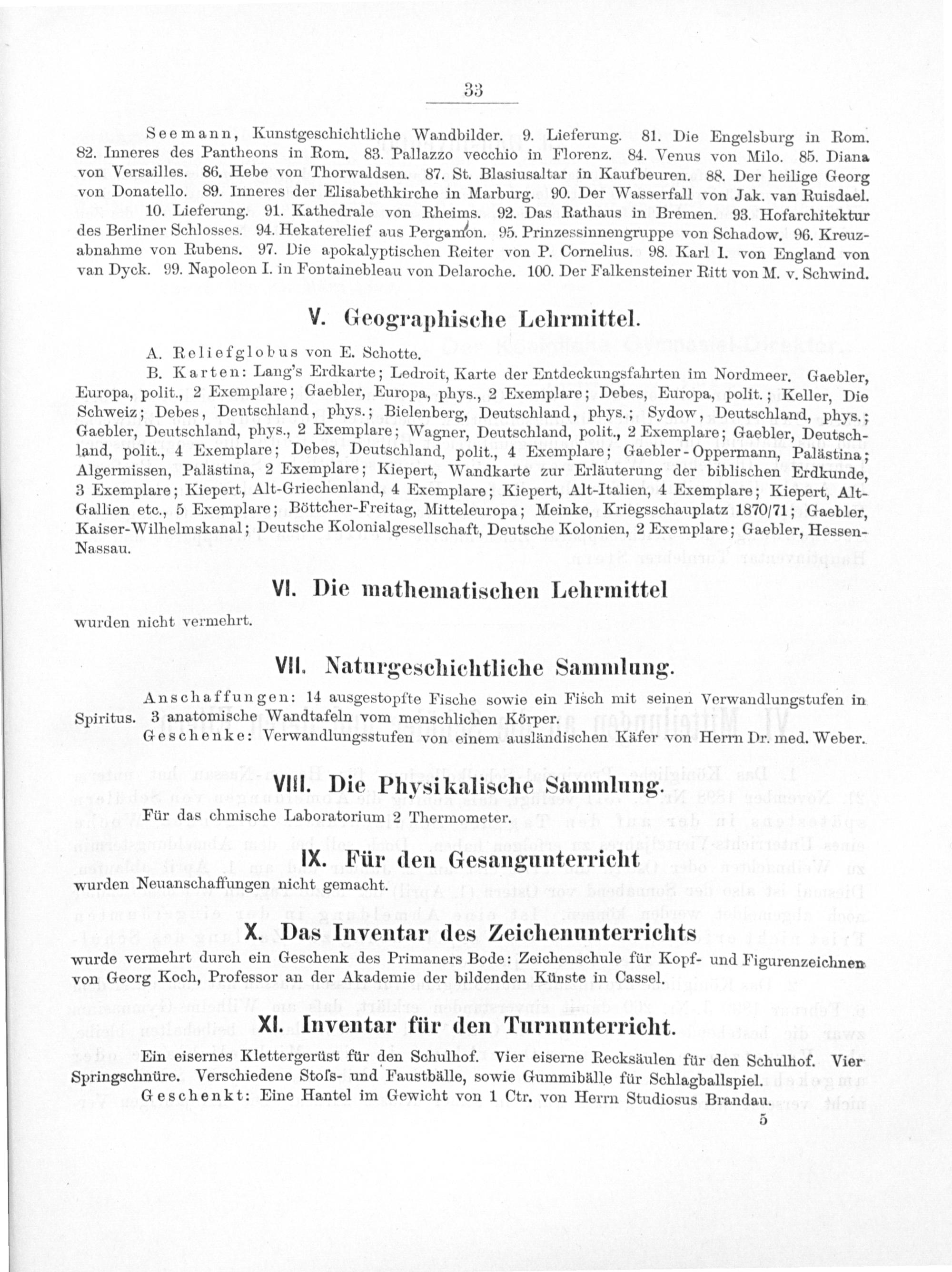 B. Karten: Lang's Erdkarte; Ledroit, Karte der Entdeckungsfahrten im Nordmeer. Gaebler, Europa, polit., 2 Exemplare; Gaebler, Europa, phys., 2 Exemplare; Debes, Europa, polit.; Keller, Die Schweiz; Debes, Deutschland, phys.; Bielenberg, Deutschland, phys.; Sydow, Deutschland, phys.; Gaebler, Deutschland, phys., 2 Exemplare; Wagner, Deutschland, polit., 2 Exemplare; Gaebler, Deutsch- land, polit., 4 Exemplare; Debes, Deutschland, polit., 4 Exemplare; Gaebler-Oppermann, Palästina; Algermissen, Palüstina, 2 Exemplare; Kiepert, Wandkarte zur Prlüuterung der biblischen Erdkunde, 3 Exemplare; Kiepert, Alt-Griechenland, 4 Exemplare; Kiepert, Alt-Italien, 4 Exemplare; Kiepert, Alt- Gallien etc., 5 Exemplare; Böttcher-Freitag, Mitteleuropa; Meinke, Kriegsschauplatz 1870/71; Gaebler, Kaiser-Wilhelmskanal; Deutsche Kolonialgesellschaft, Deutsche Kolonien, 2 Exemplare; Gaebler, Hessen-