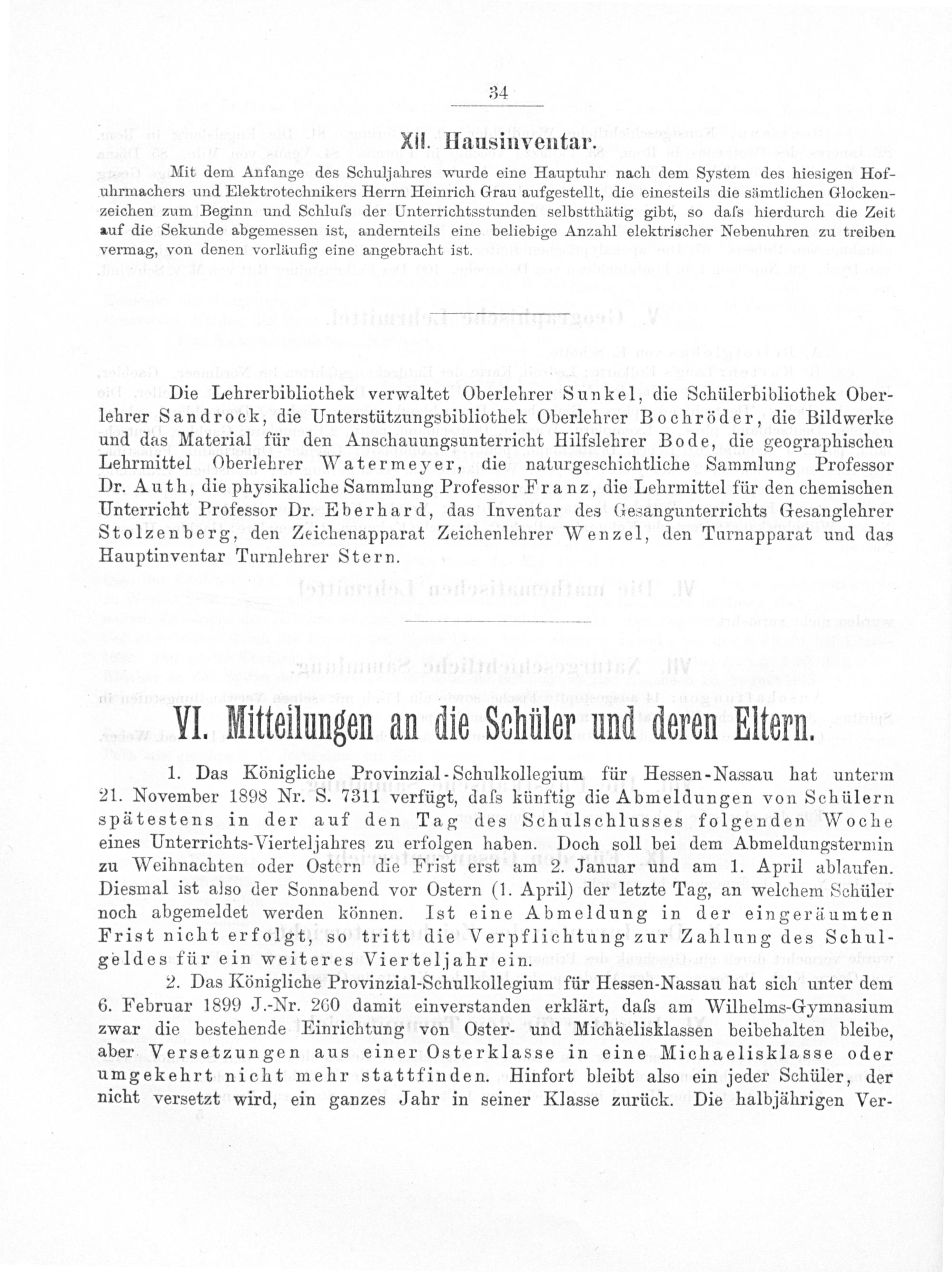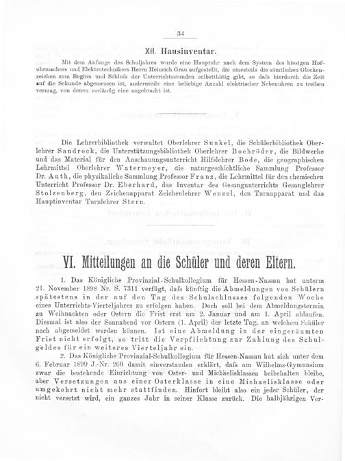 2. Das Königliche Provinzial-Schulkollegium für Hessen-Nassau hat sich unter dem 6. Februar 1899 J.-Nr. 260 damit einverstanden erklärt, daſs am Wilhelms-Gymnasium zwar die bestehende Einrichtung von Oster- und Michaelisklassen beibehalten bleibe, aber Versetzungen aus einer Osterklasse in eine Michaelisklasse oder Dumgekehrt nicht mehr stattfinden. Hinfort bleibt also ein jeder Schüler, der nicht versetzt wird, ein ganzes Jahr in seiner Klasse zurück. Die halbjährigen Ver-