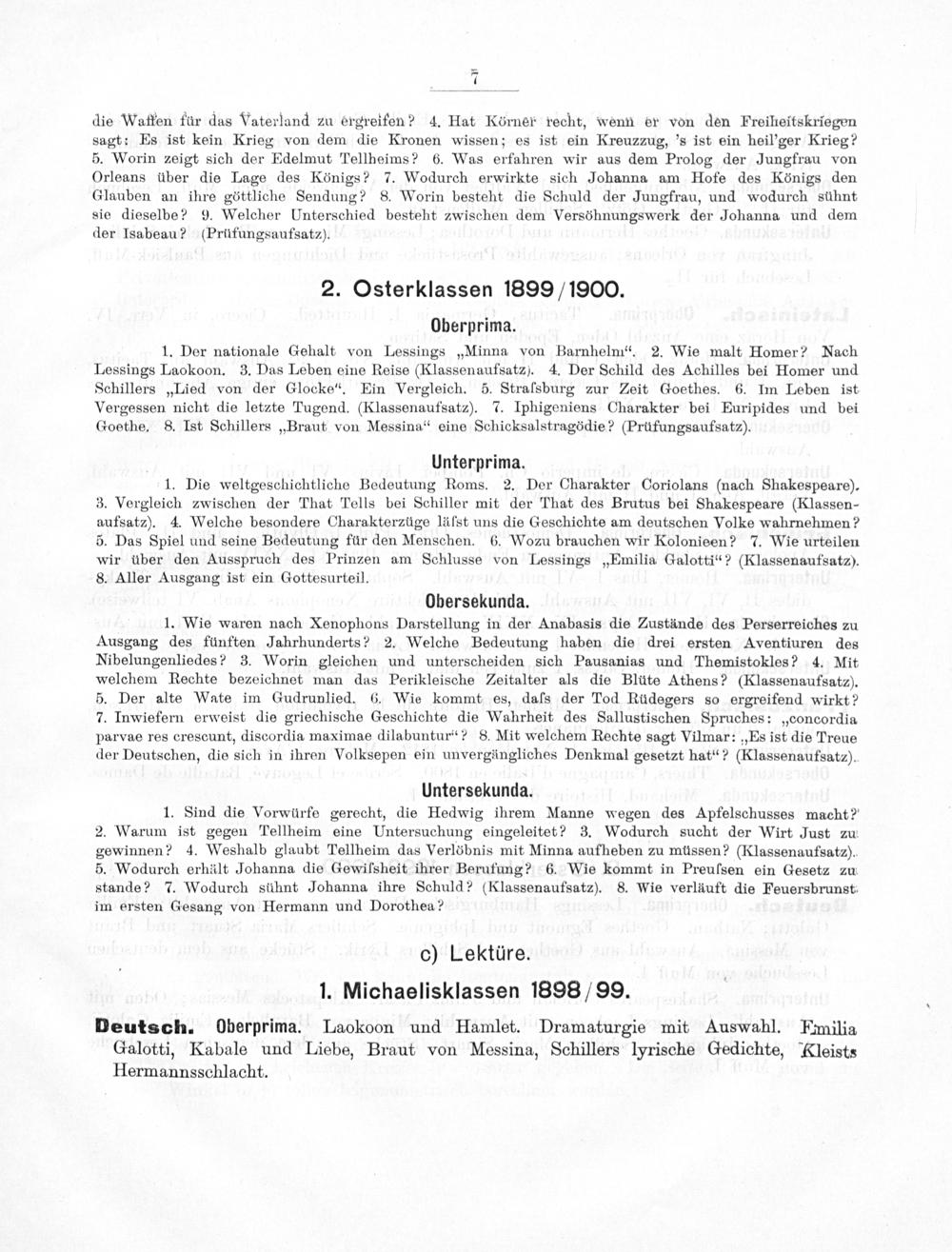 Untersekunda. 1. Sind die Vorwürfe gerecht, die Hedwig ihrem Manne wegen des Apfelschusses macht? 2. Warum ist gegen Tellheim eine Untersuchung eingeleitet? 3. Wodurch sucht der Wirt Just zu gewinnen? 4. Weshalb glaubt Tellheim das Verlöbnis mit Minna aufheben zu müssen?(Klassenaufsatz). 5. Wodurch erhält Johanna die Gewilſsheit ihrer Berufung? 6. Wie kommt in Preufsen ein Gesetz zu stande? 7. Wodurch sühnt Johanna ihre Schuld?(Klassenaufsatz). 8. Wie verläuft die Feuersbrunst: im ersten Gesang von Hermann und Dorothea?