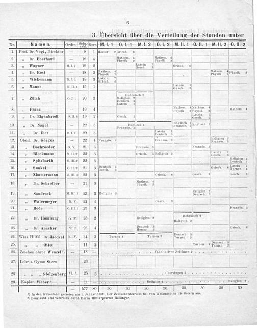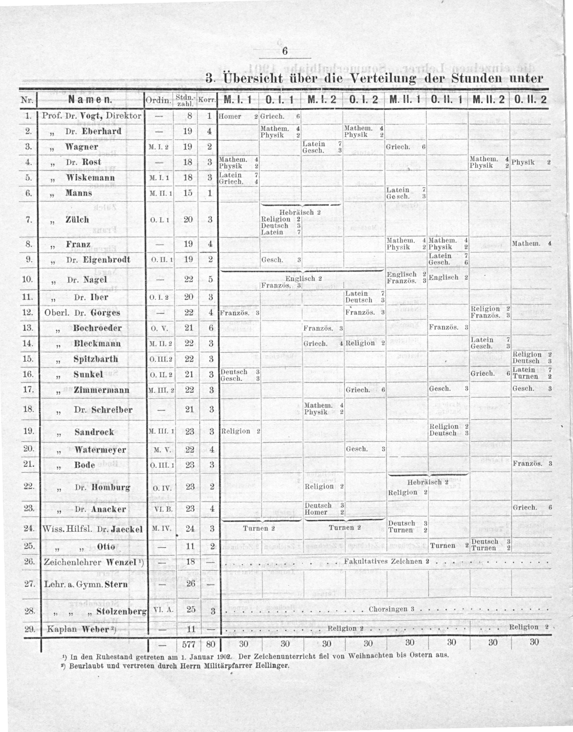¹) In den Ruhestand getreten am 1. Januar 1902. Der Zeichenunterricht fiel von Weihnachten bis Ostern aus.