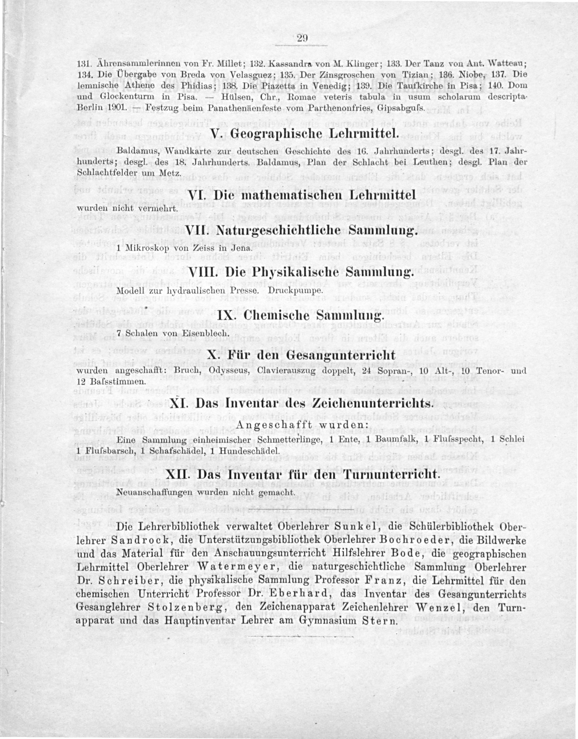Die Lehrerbibliothek verwaltet Oberlehrer Sunkel, die Schülerbibliothek Ober- lehrer Sandrock, die Unterstützungsbibliothek Oberlehrer Bochroeder, die Bildwerke und das Material für den Anschauungsunterricht Hilfslehrer Bode, die geographischen Lehrmittel Oberlehrer Watermeyer, die naturgeschichtliche Sammlung Oberlehrer Dr. Schreiber, die physikalische Sammlung Professor Franz, die Lehrmittel für den chemischen Unterricht Professor Dr. Eberhard, das Inventar des Gesangunterrichts Gesanglehrer Stolzenberg, den Zeichenapparat Zeichenlehrer Wenzel, den Turn- apparat und das Hauptinventar Lehrer am Gymnasium Stern.