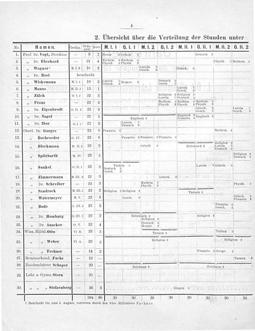 12. Oberl. Dr. Gorges— 22 5 ſpranzös. 3 Mlathem 4 13.„ Bochr oeder 0. IV. 22 6 Französ. 3 Französ. 3Franzis. 3 —————. Keligion 2 14.„ Bleckmann M. II.2 22 3 Grieéh. 4 Hebräisch 2 Latein 7 ———.— Deutsch 3 —.— tsch— 15.„ Spitzbarth M. IV. 22 3 V bentann 2 ——— 16.„ Sunkel 0. II. 1 22 3 DedescuInn 3 Latein 7Grie0 h. 6 3 Gesch. 3—— 17„ zimmermann fu. II. 2 21 3 Griech. 6.