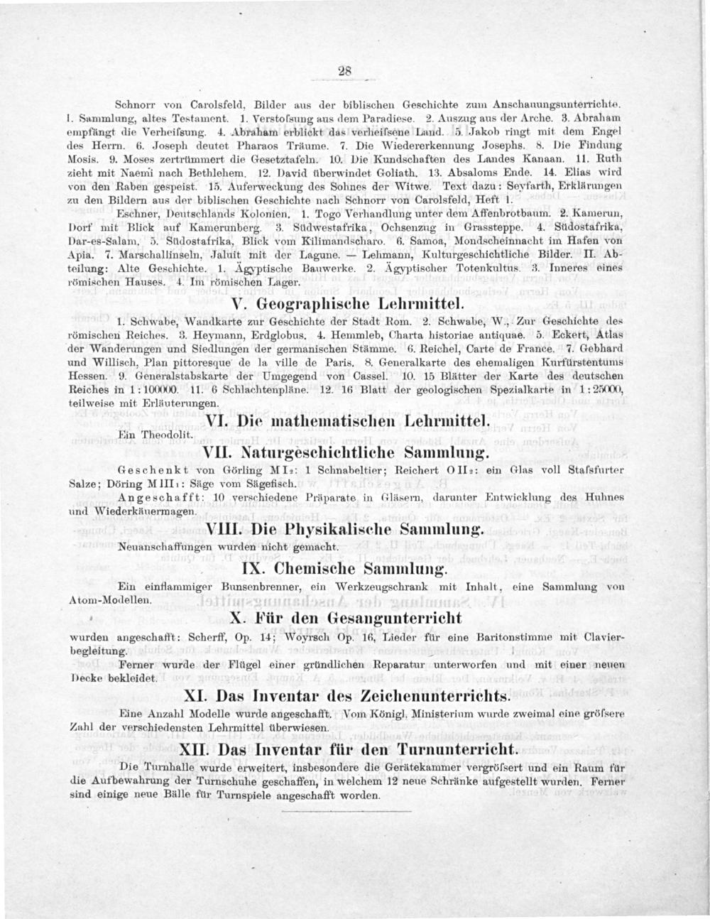 1. Schwabe, Wandkarte zur Geschichte der Stadt Rom. 2. Schwabe, W., Zur Geschichte des römischen Reiches. 3. Heymann, Erdglobus. 4. Hemmleb, Charta historiae antiqune. 5. Eckert, Atlas der Wanderungen und Siedlungen der germanischen Stämme. 6. Reichel, Carte de France. 7. Gebhard und Willisch, Plan pittoresque de la ville de Paris. 8. Generalkarte des ehemaligen Kurfürstentums Hessen. 9. Generalstabskarte der Umgegend von Cassel. 10. 15 Blätter der Karte des deutschen Reiches in 1:100000. 11. 6 Schlachtenpläne. 12. 16 Blatt der geologischen Spezialkarte in 1: 25000 teilweise mit Erläuterungen.