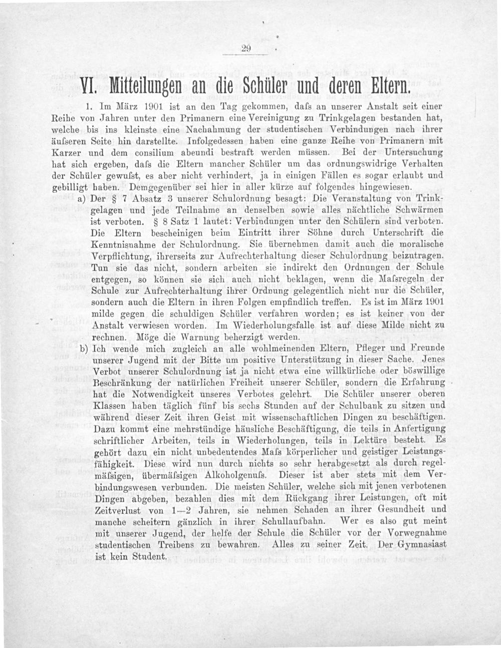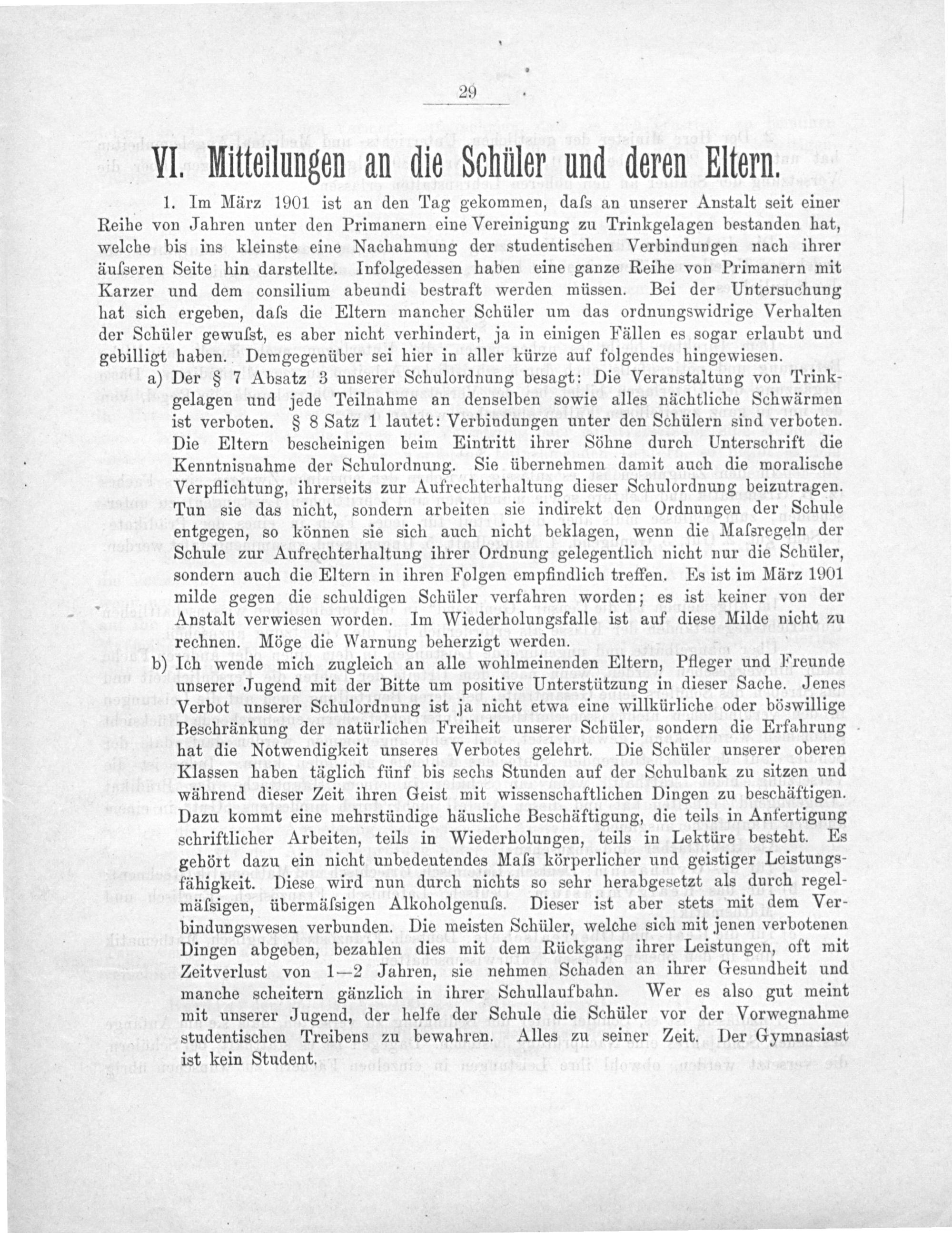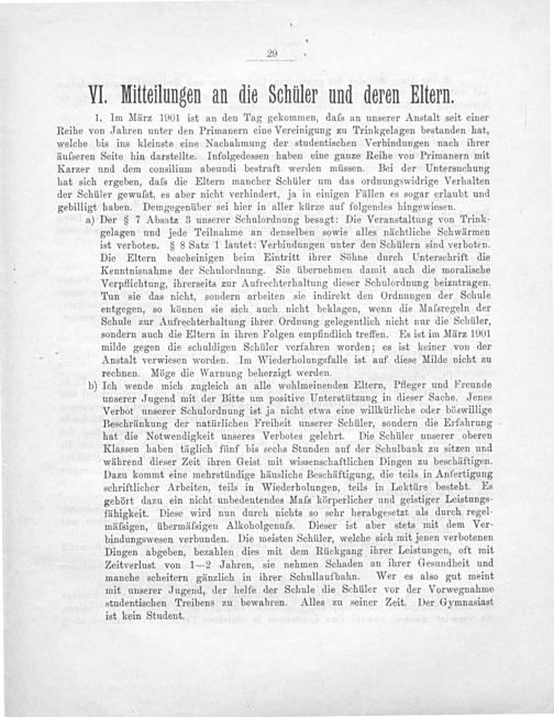 a) Der§ 7 Absatz 3 unserer Schulordnung besagt: Die Veranstaltung von Trink- gelagen und jede Teilnahme an denselben sowie alles nächtliche Schwärmen ist verboten.§ S Satz 1 lautet: Verbindungen unter den Schülern sind verboten. Die Eltern bescheinigen beim Eintritt ihrer Söhne durch Unterschrift die Kenntnisnahme der Schulordnung. Sie übernehmen damit auch die moralische Verpflichtung, ihrerseits zur Aufrechterhaltung dieser Schulordnung beizutragen. Tun sie das nicht, sondern arbeiten sie indirekt den Ordnungen der Schule entgegen, so können sie sich auch nicht beklagen, wenn die Malsregeln der Schule zur Aufrechterhaltung ihrer Ordnung gelegentlich nicht nur die Schüler, sondern auch die Eltern in ihren Folgen empfindlich treffen. Es ist im März 1901 milde gegen die schuldigen Schüler verfahren worden; es ist keiner von der Anstalt verwiesen worden. Im Wiederholungsfalle ist auf diese Milde nicht zu rechnen. Möge die Warnung beherzigt werden.