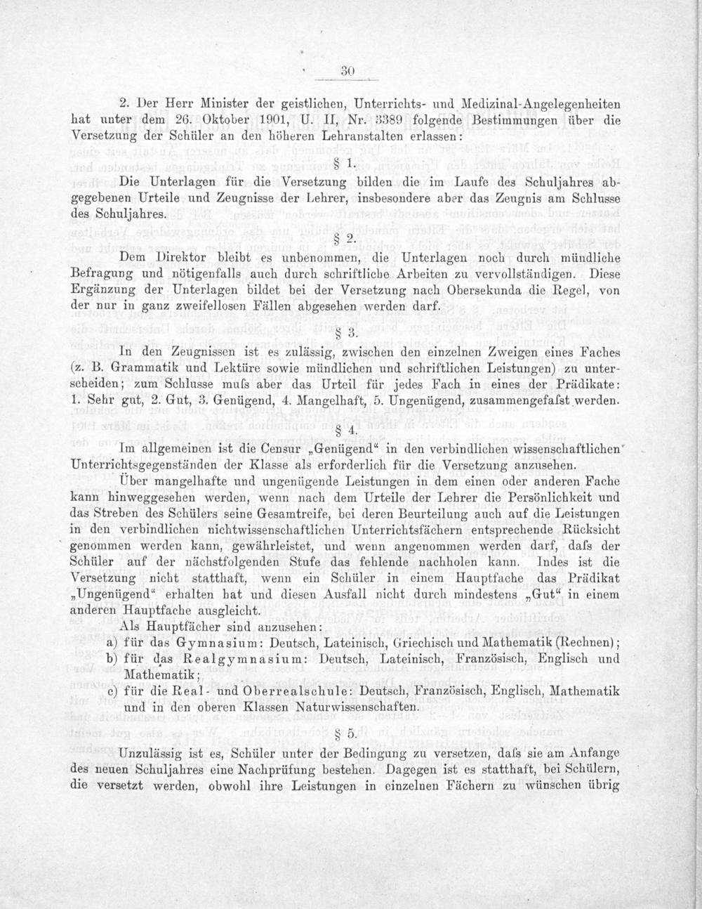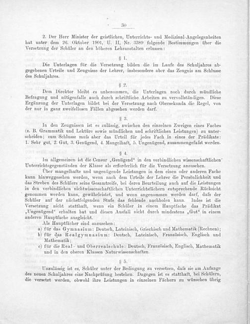 2. Der Herr Minister der geistlichen, Unterrichts- und Medizinal-Angelegenheiten hat unter dem 26. Oktober 1901, U. II, Nr. 3389 folgende Bestimmungen über die Versetzung der Schüler an den höheren Lehrapstalten erlassen: