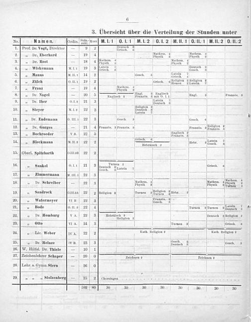 —.— 4— 1—— Nr. Namen. Ordin. Sran-korr] M. 1. 1 0. 1. 1 M. 1. 2 0. 1. 2 M. II. 1 0. II. 1 NM. 1I. 2 0. II. 2 1 Dutsch 3 lrof De vogt, Pirektor) 9.2 dreeh e V I V . 5 3 19 Mathem 1 kathem. 4 2.» Dr. Eberhard— 19 4 Physik 2 Physik 2 , ut— 7⸗ae 1[Mathem. 4“ NMathem15 3.„ Dr. Rost— 18 4 fpnysk ² Physik 2 19 3[Latein 7 Deutsch 3 4. Wiskemann M. I. 1 19 3 Griech. 6 Gesch. 3 5 I 1 1 2 ſG. 3 Latemn 7— Se 5.„ Manus M. II.11 14 2 Gesch 3 Griech. 4 u„, jan: 2 Religion 2 Religion 2 6 ulen ſoui wo, 2) Griech. Glllomtor. 2 laatefn. 7 P Mathem. 4— 7.„ Franz— 19 4 Tnyaik 2 7 E—yutmner 2 nglisch 8.„ Dr. Nagel 1 20 5nglisch 2 Französ. 3 mit O. I. 1 Engl. 22 Fran76. 3 2 Latein 7 5 9. e lher beutseh 3— 4 Religion 2 10.„ Steyer M. I.2 22 3 Deutsch 3 uI Latein 7 ———— 11.„ Dr. Endemann 0. III. 1 22 3 Gesch. 3 Gesch 6 ———————————— 12„ Dr. Gorges— 21 4 Französ. 3 Französ. 3 Französ. 3 Keligion 2 ————.——— 28— 8 5 Englisch 2 13.„ Bochroeder B. 22 5 Französ. 3 18ö ſſſ 5— Griech. 6;„ 32 3 Latein 7 14.„ Bleckmann M. II. 2 22 2 Hebr. 2 Gesch. 3 ——————ebräisch 2——— 15. Oberl. Spitzbarth 0.III.2 22 2 16. Sunkel 0.11 21 3 TUurnen 2 Griech. 6 „.1. Deutsch 3 7 6 —— Beachn alatem ¹„„—— 17„ Zimmermann jYr. III. 1 22 3 Mathem. 4 -. J-. 9 2 Mathem. 4 Mathem. 4 2 18 Dr. Sehreiber 22 3 rus 2Aeſ Physik 2 Physihk 2² 19.„ Sandrock 0. III.2A 22 2 Religion 2 Turnen 2 Rollglan 2 Hebr. 2 7. o„“ Französ. 3— 20.„ Matermeyer VI B 8 22 3* Hesch. 3 21.„ Bode 0. II. 2 22 4 Turnen 2 Turnen 2 Patetnn 7 ———-:x——— 4 5 22.„ Dr. Homburg V A 22 3 Mobrädehm zon. V Deutsch 3 Religion 2 eligi- 23.„ Otto VI A 24 3 Turnen 2 Griech. 6 24.„ Lie. Weber Iv A¹ 22 2 kath. Religion’2 Kath. Religion 2 ———— 3———— 2 6 9— 25.„ Dr. Heinze VB 23 3 1 Beninen 3 We esch. 3 26. W. Hilfsl. Dr. Thiele— 10 1 27.[Zeichenlehrer Schaper— 20 0 3 Zeichnen 2 Leichnen 2 1 1———— 28. Lehr. a. Gymn. Stern— 26 0. 5—, 1— 1 29.„„„ Stolzenberg- 25 2 cChorsingen * 59² 80 30 30 30 30 30 30 30 30
