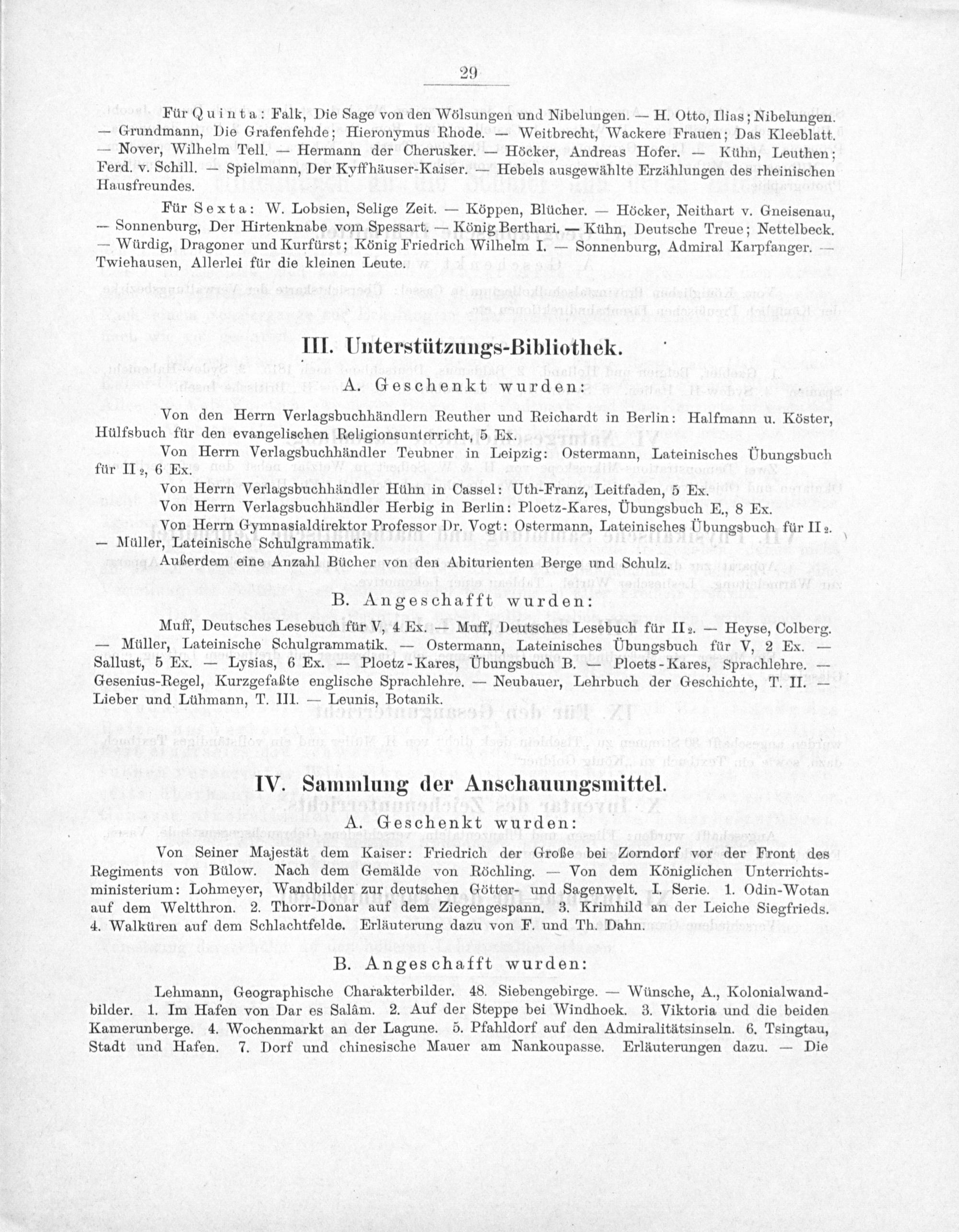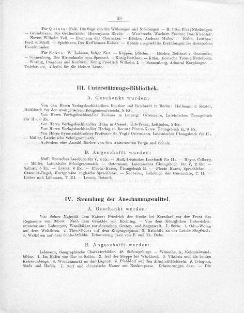 Muff, Deutsches Lesebuch für V, 4 Ex.— Muff, Deutsches Lesebuch für IIz.— Heyse, Colberg. — Müller, Lateinische Schulgrammatik.— Ostermann, Lateinisches Ubungsbuch für V, 2 Ex.— Sallust, 5 Ex.— Lysias, 6 Ex.— Ploetz-Kares, UÜbungsbuch B.— Ploets-Kares, Sprachlehre.— Gesenius-Regel, Kurzgefaßte englische Sprachlehre.— Neubauer, Lehrbuch der Geschichte, T. II.— Lieber und Lühmann, T. III.— Leunis, Botanik.