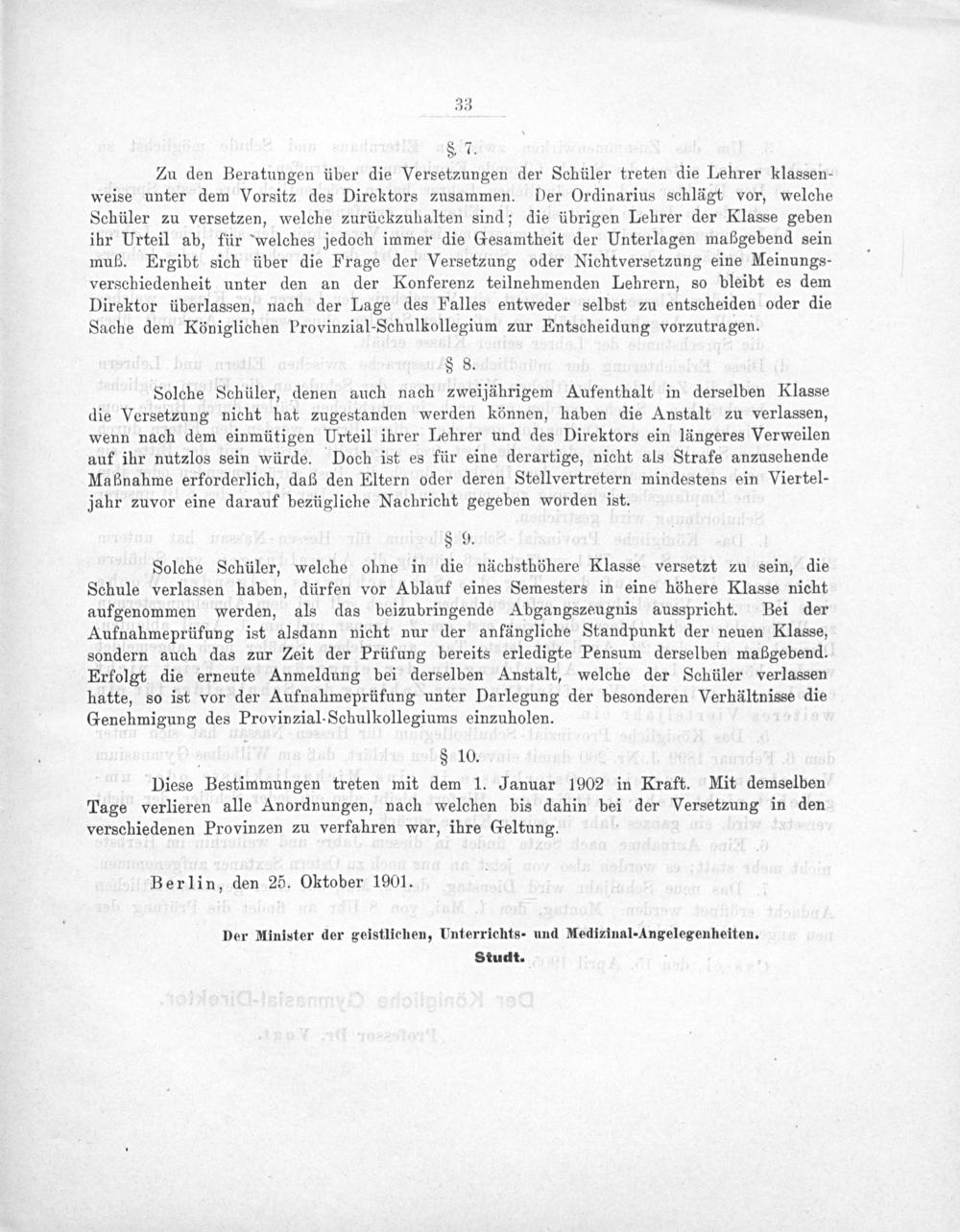Zu den Beratungen über die Versetzungen der Schüler treten die Lehrer klassen- weise unter dem Vorsitz des Direktors zusammen. Der Ordinarius schlägt vor, welche Schüler zu versetzen, welche zurückzuhalten sind; die übrigen Lehrer der Klasse geben ihr Urteil ab, für welches jedoch immer die Gesamtheit der Unterlagen maßgebend sein muß. Ergibt sich über die Frage der Versetzung oder Nichtversetzung eine Meinungs- verschiedenheit unter den an der Konferenz teilnehmenden Lehrern, so bleibt es dem Direktor überlassen, nach der Lage des Falles entweder selbst zu entscheiden oder die Sache dem Königlichen Provinzial-Schulkollegium zur Entscheidung vorzutragen.