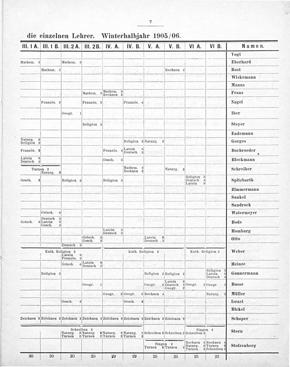 die einzelnen Lehrer. Winterhalbjahr 1905/06.
