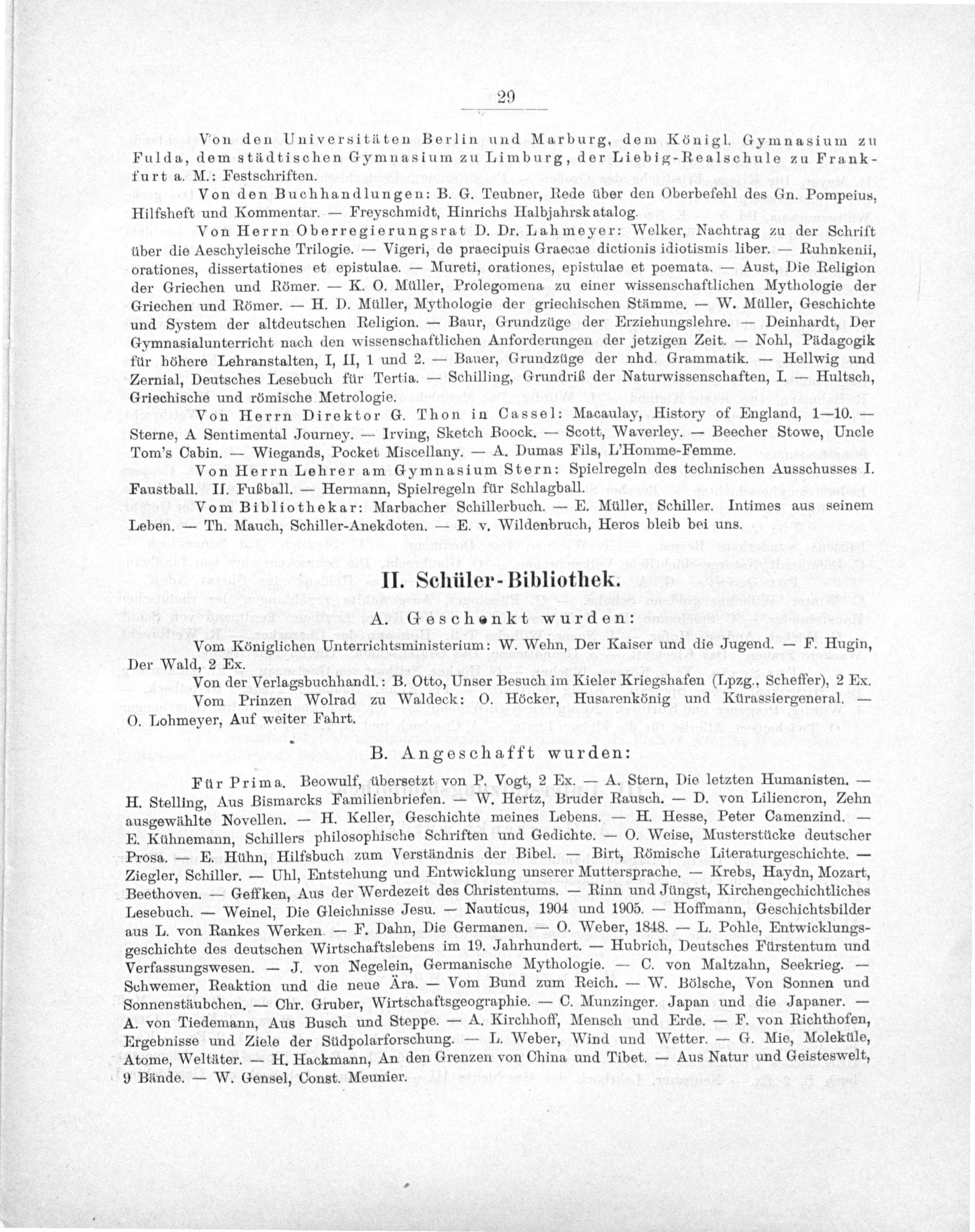 Für Prima. Beowulf, übersetzt von P. Vogt, 2 Ex.— A. Stern, Die letzten Humanisten.— H. Stelling, Aus Bismarcks Familienbriefen.— W. Hertz, Bruder Rausch.— D. von Liliencron, Zehn ausgewühlte Novellen.— H. Keller, Geschichte meines Lebens.— H. Hesse, Peter Camenzind.— E. Kühnemann, Schillers philosophische Schriften und Gedichte.— O. Weise, Musterstücke deutscher Prosa.— E. Huhn, Hilfsbuch zum Verständnis der Bibel.— Birt, Römische Literaturgeschichte.— Ziegler, Schiller.— Uhl, Entstehung und Entwicklung unserer Muttersprache.— Krebs, Haydn, Mozart, Beethoven.— Geffken, Aus der Werdezeit des Christentums.— Rinn und Jüngst, Kirchengechichtliches Lesebuch.— Weinel, Die Gleichnisse Jesu.— Nauticus, 1904 und 1905.— Hoffmann, Geschichtsbilder aus L. von Rankes Werken.— F. Dahn, Die Germanen.— O. Weber, 1848.— L. Pohle, Entwicklungs- geschichte des deutschen Wirtschaftslebens im 19. Jahrhundert.— Hubrich, Deutsches Fürstentum und Verfassungswesen.— J. von Negelein, Germanische Mythologie.— C. von Maltzahn, Seekrieg.— Schwemer, Reaktion und die neue Kra.— Vom Bund zum Reich.— W. Bölsche, Von Sonnen und Sonnenstäubchen.— Chr. Gruber, Wirtschaftsgeographie.— C. Munzinger. Japan und die Japaner.— A. von Tiedemann, Aus Busch und Steppe.— A. Kirchhoff, Mensch und Erde.— F. von Richthofen, Ergebnisse und Ziele der Sudpolarforschung.— L. Weber, Wind und Wetter.— G. Mie, Moleküle, Atome, Weltäter.— IH. Hackmann, An den Grenzen von China und Tibet.— Aus Natur und Geisteswelt,