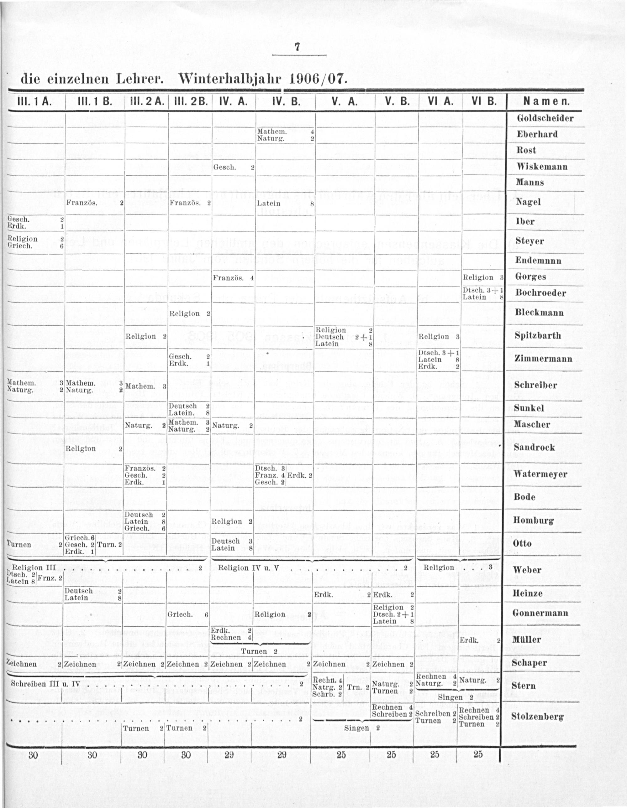 die einzelnen Lehrer. Winterhalbjahr 1906/07.