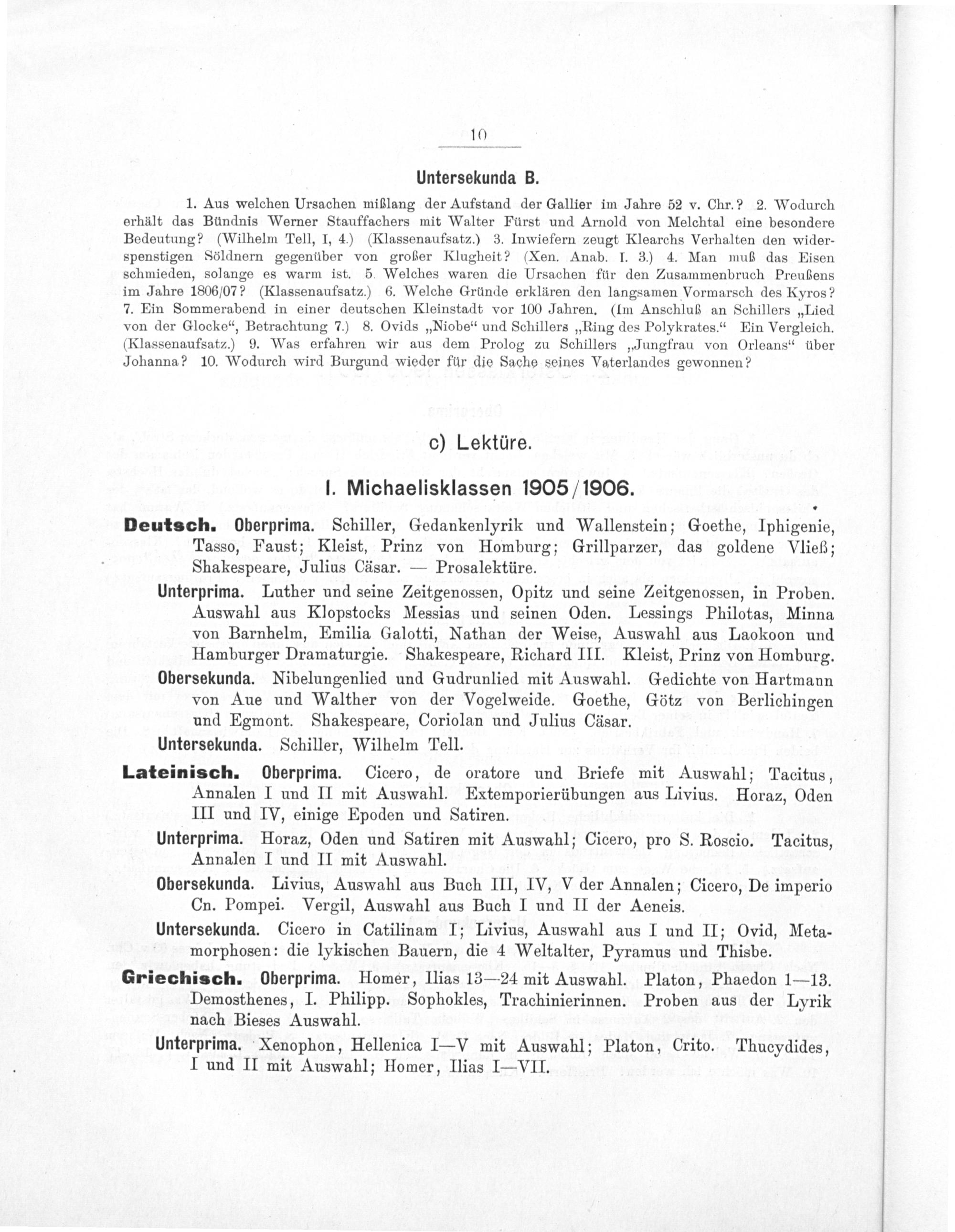 Deutsch. Oberprima. Schiller, Gedankenlyrik und Wallenstein; Goethe, Iphigenie, Tasso, Faust; Kleist, Prinz von Homburg; Grillparzer, das goldene Vließ; Shakespeare, Julius Cäsar.— Prosalektüre.