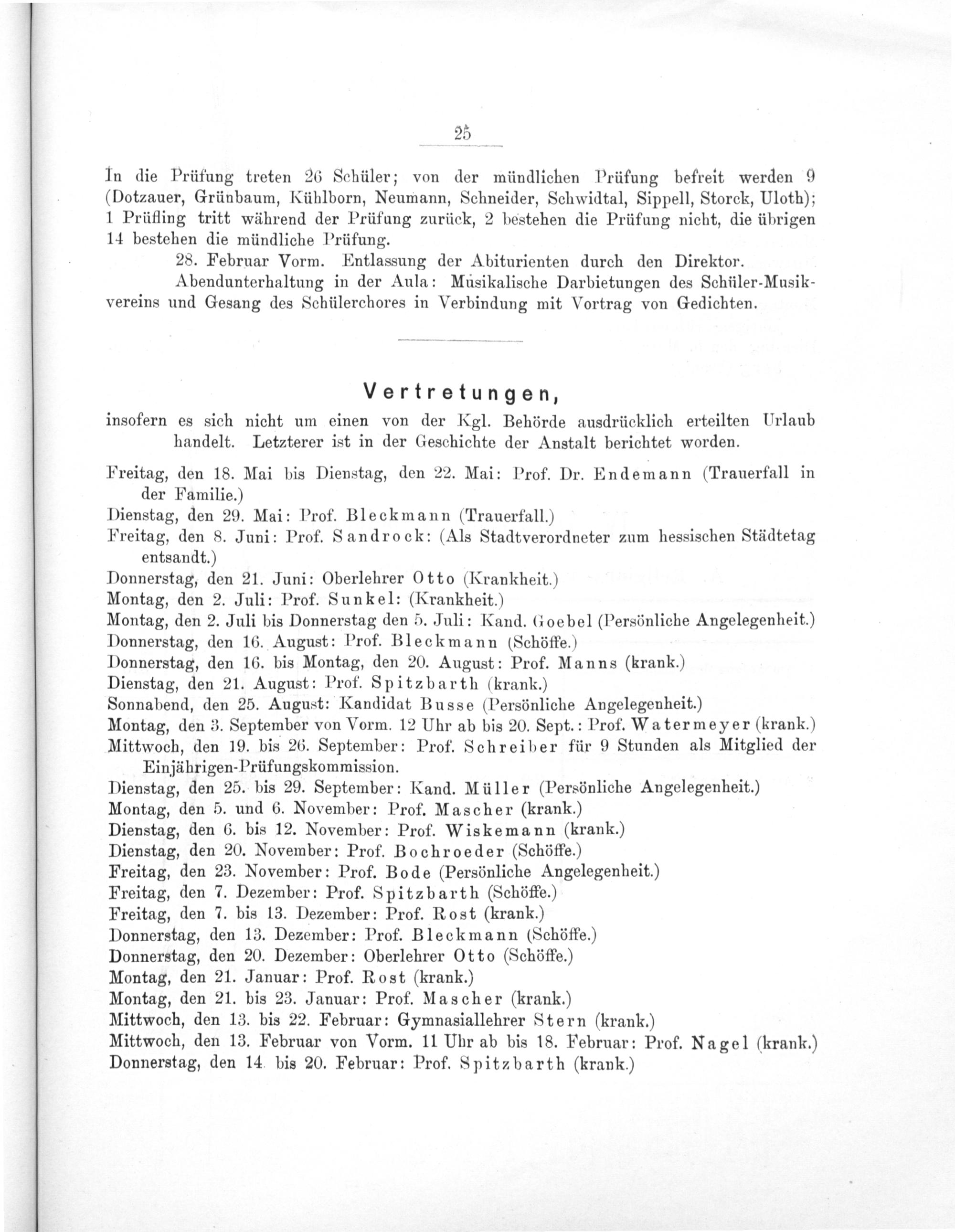 In die Prüfung treten 26 Schüler; von der mündlichen Prüfung befreit werden 9 (Dotzauer, Grünbaum, Kühlborn, Neumann, Schneider, Schwidtal, Sippell, Storck, Uloth); 1 Prüfling tritt während der Prüfung zurück, 2 bestehen die Prüfung nicht, die übrigen 14 bestehen die mündliche Prüfung. 28. Februar Vorm. Entlassung der Abiturienten durch den Direktor. Abendunterhaltung in der Aula: Musikalische Darbietungen des Schüler-Musik- vereins und Gesang des Schülerchores in Verbindung mit Vortrag von Gedichten.