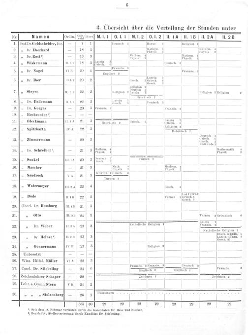 ——— 5—— Nr Namen Ordin-Sn Korr] M. I. 1 0. I. 1 H. l. 2 0. l. 2 II. 1A II. 18 lI. 24 IlI. 2 B 1.[Prof. Dr. Goldscheider, Dir.]— 71 Deutsch 3 Horaz 2 Religion 2 2.„ Dr. Eberhard— 18 3 Nachfn. 1 Matl —— 18 3— Mathem- 4—— Mathem. 1— „ Dr. Rost ¹)— 18 3 1 physik2hysik2———— „ Wiskemann M. L1 18 3 datein 7 Deutsch 3 —— 6 Französ. 3 unm ln 1 1 5.„ Dr. Nagel VvI B. 20 4. Französ. 3 — /2ßhꝛß22:—:—ꝛ—ö M WBôçö W⅓e„⸗—ß“Gõ"ÖA[LEHWAêfnnglisch 2——— Latein 5—— 1 6.„ Dr. Iber 0. I. 21 20 V 2 dGesch. 3Griech. 6 ————— 1 Gesch. 3— V Reuglon 2 eutsc 3 7.„ Steyer M. I. 2 22 2 Religion 2 Latein 7 Religion 2 Religion 2 ——,—,——— ee.— 8.[„ Dr. Endemann 0.11 22 3 Sareha 3 Deutsch 3 9.„ Dr. Gorges— 2 5 SFranzös. 3 —— ʒ̊ooqq— o/—q———— 10., Bochroeder ²)——— .„, 2² g—————— 11.„ Bleckmann ü. 414 21 3 Hepräisch 2 Griech. 6 Griech. 6— .— 2 3— Rellgion 2 12., Spitzbarth IV A 2— ————————— eetsch— 13.„„ Zimmermann— 20 3 Prioch. 4 ———. Erdkunde 1 o 3 Mathem. 4 Mathematik 4 14.„ Dr. Schreiber ³)— 21 3 ſohysik 2 Physik 2 2 0 D5 2 8C 3 P—————9—— 15.„ Sunkel II. 1Aà 20 3[zbucheh Tuinon 2 ˖— ʃ—L:O—˖:——naaaʒ——————————39————— . 5 Math. 4 Mathem. 4 16. Mascher—- 21 3 Physik 2 Physik 2... 1 —. teligion 2 Griech. 6—— 17.„ Sandrock và 21 3 1 9§ÿ3ℳ3§3ℳunͤue¶An—d l[ Turnen 2—— 18. Watermeyer III. 2 4 22 4 Gesch. 3 ——————— Lat7 Trn.2—— 19.„ Bode II. 1B 22 2 Turnen 2(Griech. 6 —— Gesch 3——— 20.] Oberl. Dr. Homburg III. 1B 21 3 21.„ 0tto III. 2 B 24 3 Turnen 2(Griechisch 6 ——-—————— Latein, 3 4 22.„ Dr. Weber II. 2 A 23 3 atholische Religion Französ. 3 —— Katholische Religion 2 —— ꝗ———— ʒoↄ—— Dtsch. 3 Erdk. 1 23., Dr. Heinze ⁴) II. 2 B 23 3 Latein 7 Turn. 2 4———— desch. 2 24.„ Gonnermann IVB 23 3 V Religion 2 V 25 Unbesetzt——— 26.] Wiss. Hilfsl. Müller VIA 22 3 „„„ eeeeexxeeeeee pranzds. 3 Franzds. 3 Deutsch-3—— 1 27. Cand. Dr. Stiebeling— 24 6 V— Fnglisch 2 Französ. 28. Zeichenlehrer Schaper— 20— Zeichnen 2 Zeichnen 2 29. Lehr. a. Gymn. Stern VB 24 2 V ———— l-—QQ——C—ꝭ—O—OC—Q—n,A,A,aA— 30.„„„ Stolzenberg 26 1 4... V.. V.. [585 80ſ 22 29 ſ ⁰ 292 29. 29 29 29 29
