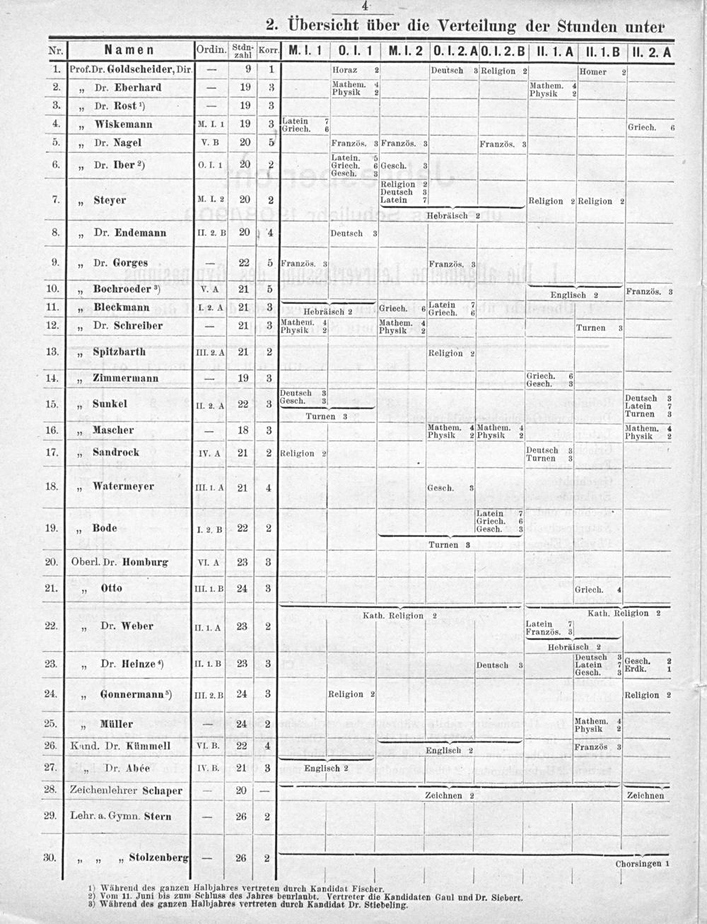 Nr. Namen Ordin. Seau Korr] M. I. 1 0. I. 1· M. l. 2 0. 1. 2. A0. I. 2. B Il. I. A II. 1. B ll. 2. A 1.[Prof. Dr. Goldscheider, Dir.— 9 1 Horaz 2 peutsch ³ Religion 2 Homer 2 19 3 Mathem. 4 Mathem 1 2.„ Dr. Eberhard 19 3 Physik 2 Luysik 3 3.„ Dr. Rost ¹)- 19 3 4.„ Wiskemann M. I. 1 19 3 Gatein 7 Griech. 6 5.„ Dr. Nagel V. B 20 5 Französ. 3 Französ. 3 Französ. 3 katein. 6.„ Dr. Iber ²) O. 1. 1 20 2 Griech. 6 Gesch. 3 — 1 Gesch. 3 Religion 2 Deutsch 3 7.]„ Steyer M. I. 2 20 2 Latein 7 Religion 2 Religion 2 Hebräisch 2 8.„ Dr. Endemann II. 2. B 20 4 Deutsch 3 9.„ Dr. Gorges— 22 5 TFranzös. 3 Französ. 3 10.„ Bochroeder ³) Vv. A, 21 5 1— 1 Englisch 2 Französ. 3 4 Latein 7 11.]„ Pleckmann L2A 21] 3—Aprälseh 2 riech. Wriech. 6 7 Mathem. 4 Mathem. 4 42.]/* Dr. Schreiber— 21 3 irale Tbnie. 4—— Turne 4 13.„ Spitzbarth III. 2. A4 21 2 Religion 2 —. Griech. 6 14.„ Zimmermann— 3— Gech. 3 Deutsch 3 Deutsch 3 15.„ Sunkel II 2. 4 22 3 Gesch. 23 Latein 7 Turnen 3 Turnen 3 12„ 1142 Mathem. 4 Mathem. 4 3 Mathem. 4 16.„ Mascher— 18 3 Physik 2 Physik 2 lhpsik 17.„ Sandrock IV. A 21 2 HReligion 2. Vorten 3 18.]„ Watermeyer III. 1. A 21 4 Gesch. 3 * Latein 7 Griech. 6 19.„ Bode I. 2. B 22 2 Gesch. 3 —— Iunens-s— 20. Oberl. Dr. Homburg VI. A 23 3 21.„ Otto III. 1. B 24 3 Griech. 4 Kath. Religion 2— Kath. Religion 2 5 Latein 7 22.„ Dr. Weber II. 1. 4 23 2 Französ. 3 ———— Hebräisch 2 Deutsch 3 3 j Gesch. 2 23.„ Dr. Heinze ⁴) II. 1. B 23 3 Deutsch 3 Patein Prdk. 1 24.„ Gonnermann?) III. 2. B) 24 3 Religion 2 Religion 2 55 Mathem. 4 25„ Nüller— 24 2 Physkk 2 26. Kand. Dr. Kümmell VI. B. 22 4 Englisch 2— Französ 3 —— — 27.„ Dr. Abée IV. B. 21 3 Bnslabh 2 V 5 2— 1. 4— 9,9———— 28. Zeichenlehrer Schaper— 20—— Zeichnen 2 Zeichnen — 29. Lehr. a. Gymn. Stern— 26 2 I b V V 30.„„„ Stolzenberg— 26 2 V Chorsingen 1