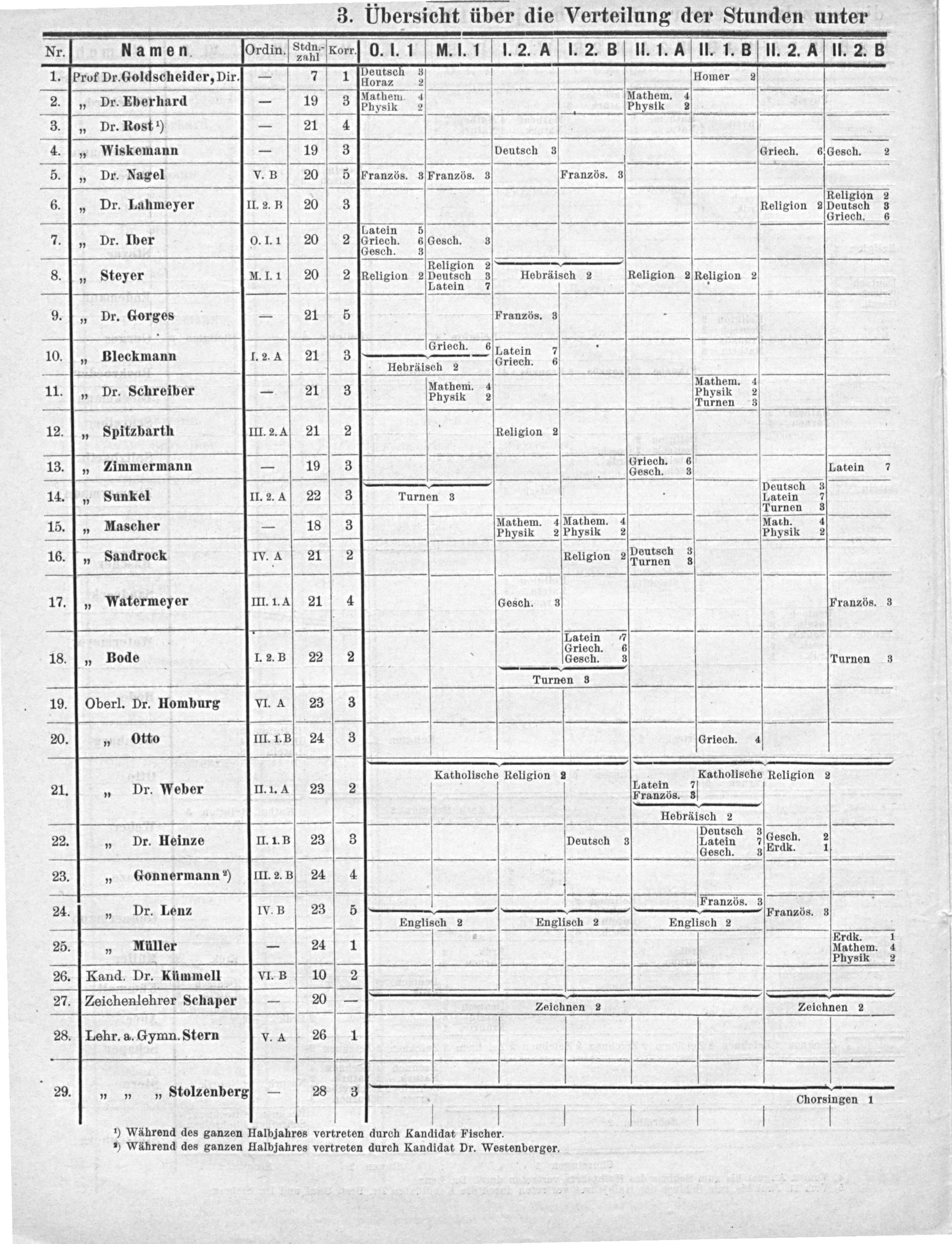 Nr. Namen. Ordm Sean- korr O. lI. 1] M. I. 1 I. 2. A I. 2. B II. 1. A II. 1. B II. 2. A II. 2. B 1.[Prof Dr. Goldscheider, Dir.]— 71 Beutooh 2 Homer 2 Mathem. 4 Mathem. 4 2.„ Dr. Eberhard— 19 3 Physik 2— Physik 2 3.„ Dr. Rost ¹)— 21 4 4.„ Wiskemann— 19 3 Deutsch 3 driech. 6 Gesch. 2 5.„ Dr. Nagel V. B 20 5 yranzös. 3 Französ. 3 Französ. 3 Religion 2 6.„ Dr. Lahmeyer II. 2. R 20 3 Religion 2'entoch 3 Griech. 6 Latein 5 7.„ Dr. Iber 0. I. 1 20 2[driech. 6 Gesch. 3 8 Gesch. 32 Religion 2 8.„ Steyer M. I. 1 20 2 Religion 2 Deutsch 3 Hebräisch 2 Religion 2Religion 2 Latein 7 4 9.„ Dr. Gorges— 21 5 Französ. 3 Griech. 6 3 10. Bleckmann 1.2. 4 21 3 Latein 7 6 Hebräisch 2 Griech. 6 Mathem. 4 11. Dr. Schreiber-— 21 3 Mathem. 4 Physik 2 8. Fhysike 2 Tulnen 3 12.„ Spitzbarth III. 2. A 21 2 Religion 2 13.„ Zimmermann— 10 3 Friech. 6 Latein 7 Deutsch 3 14.„ Sunkel II. 2. à 22 3 Turnen 3 3 Latein 7 — Turnen 3 — Mathem. 4 Mathem. 4 Math. 4 15.„ Mascher 18 3 Physik 2—'hysik 2 Physik 2 h 3 16.„ Sandrock WV. A 21 2 Religion 2 Poutsch 3 17.„ Watermeyer III. 1. 4 21 4 Gesch. 3 Französ. 3 Eebein 3 ech. 18.„ Bode I. 2. B 22 2 Gesch. 3 Turnen 3 —— Turnen 3 19. Oberl. Dr. Homburg VI. A 23 3 20.„ Otto III. 1.B 24 3 Griech. 4 Katholische Religion 2 Neter„Kathollsch Religion 2 2 atein 21.„ Dr. Weber Il. 1. à 23 2 Pateim 7 Hebräisch 2 Deutsch 3 22.„ Dr. Heinze Il. 1.3 23 3 Deutsch 3 Patolu„esch. 1 Gesch. 3 Erdk. 23.„ Gonnermann*) III. 2. B 24 4 Französ. 3 24.„ Dr. Lenz IV.B 23 5 Tan23. 3, n258, 3 Englisch 2 Englisch 2 Englisch 2² Erdk. 1 25.„ MNüller— 24 1. Mathem. 4 — Physik 2 26. Kand. Dr. Kümmell VI. B 10 2 27.[Zeichenlehrer Schaper— 20— Zichuen-r Zeichaen-2 28. Lehr. a. Gymn. Stern V. A 26 1 29.„„„ Stolzenberg— 28 3 Torcagen
