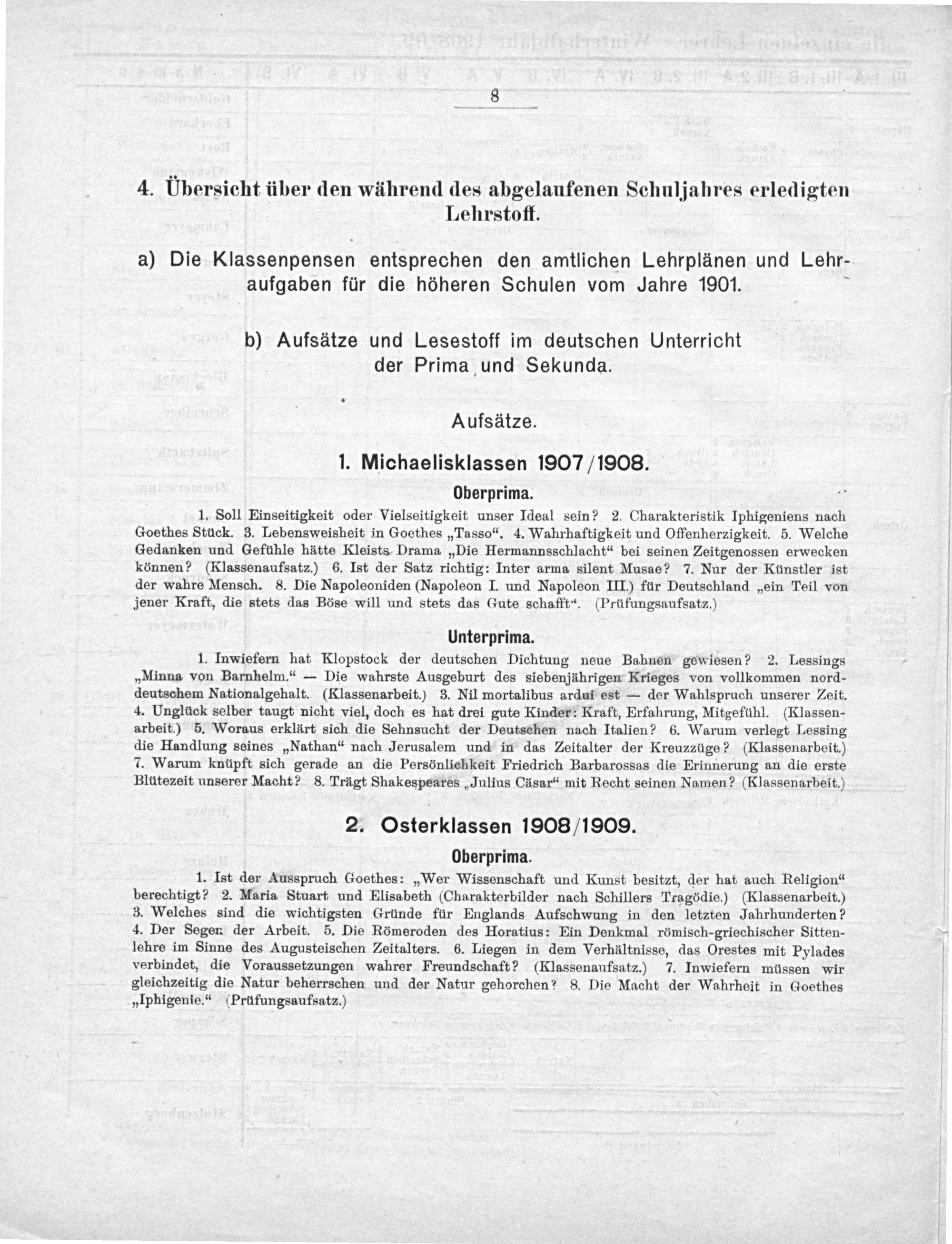 1. Soll Einseitigkeit oder Vielseitigkeit unser Ideal sein? 2. Charakteristik Iphigeniens nach Goethes Stück. 3. Lebensweisheit in Goethes„Tasso“. 4. Wahrhaftigkeit und Offenherzigkeit. 5. Welche Gedanken und Gefüühle hätte Kleists Drama„Die Hermannsschlacht“ bei seinen Zeitgenossen erwecken können?(Klassenaufsatz.) 6. Ist der Satz richtig: Inter arma silent Musae? 7. Nur der Künstler ist der wahre Mensch. 8. Die Napoleoniden(Napoleon I. und Napoleon III.) für Deutschland„ein Teil von jener Kraft, die stets das Böse will und stets das Gute schafft“.(Prüfungsaufsatz.)