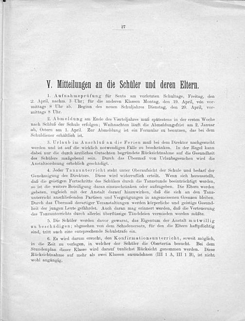 4. Jeder Tanzunterricht steht unter Oberaufsicht der Schule und bedarf der Genehmigung des Direktors. Diese wird widerruflich erteilt. Wenn sich herausstellt, daß die geistigen Fortschritte des Schülers durch die Tanzstunde beeinträchtigt werden, so ist die weitere Beteiligung daran einzuschränken oder aufzugeben. Die Eltern werden gebeten, zugleich mit der Anstalt darauf hinzuwirken, daß die sich an den Tanz- unterricht anschließenden Partieen und Vergnügungen in angemessenen Grenzen bleiben. Durch das UÜbermaß derartiger Veranstaltungen werden körperliche und geistige Gesund- heit der jungen Leute gefährdet. Auch daran mag erinnert werden, daß die Verteuerung des Tanzunterrichts durch allerlei überflüssige Tändeleien vermieden werden müßte.