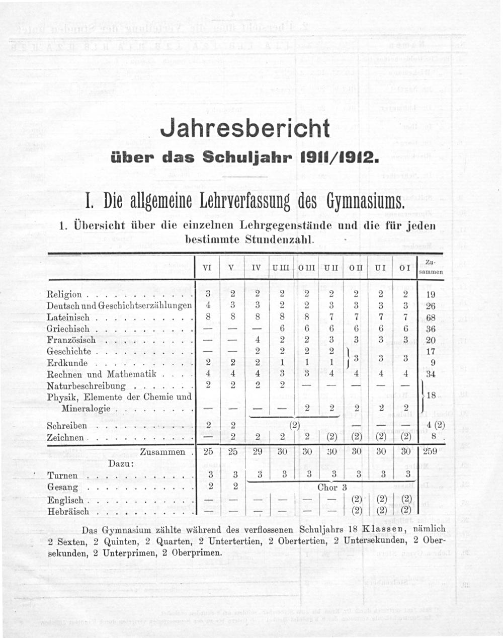 Das Gymnasium zählte während des verflossenen Schuljahrs 18 Klassen, nämlich 2 Sexten, 2 Quinten, 2 Quarten, 2 Untertertien, 2 Obertertien, 2 Untersekunden, 2 Ober-