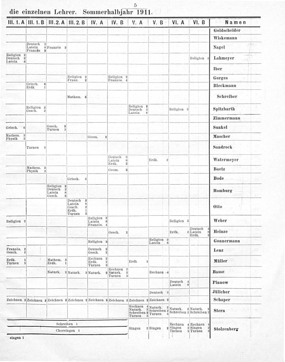 5 die einzelnen Lehrer. Sommerhalbjahr 1911.