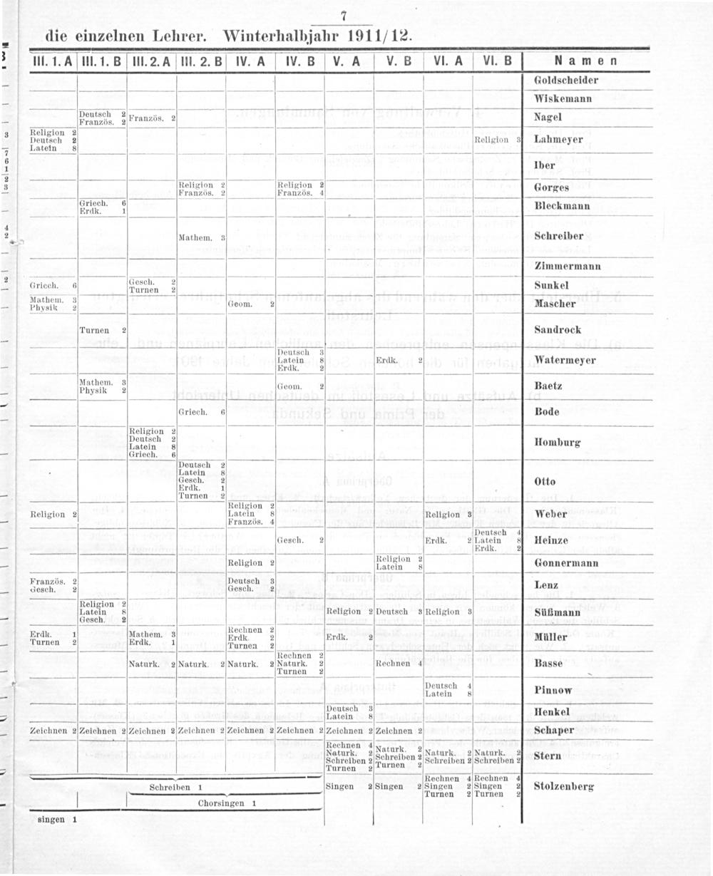7 die einzelnen Lehrer. Winterhalbjahr 1911/12.