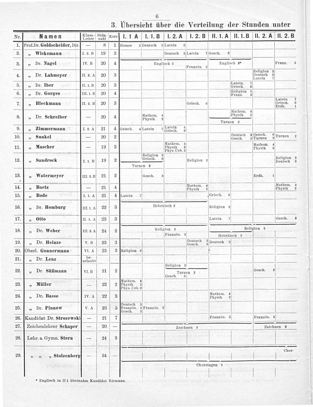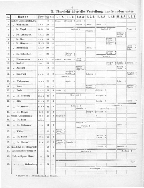 —j—————— Nr. Namen Kinas. Sean. Korrf I. 1A I. 1. B 1. 2. A I. 2. B] II. 1. A] II. 1.B II. 2. A II. 2. B 1.[Prof. Dr. Goldscheider, Dir.]— 8 1 Deutsch 3Latein 3 2.„ Wiskemann I. 2. B 19 3 Deutsch 3Latein desch. 3 3.]„ Dr. Nagel IV. B 20 4 Englisch 2 Englisch 2* Franz. 3 Französ. 3 4 — 7 Religion 2 4.„ Dr. Lahmeyer II. 2. An 20 3 Deutsch 3 Latein 7— —Latein. 7 5.„ Dr. Iber II. 1.B 20 3 Getesn. 6.„ Dr. Gorges III. 1. B] 20 4 Fellgion? 2 Bleck 4 0 3— Fatain 7 eckm II. 2. B Griech. riech. 6 7.„ ann 2 Ti90 1 Erdk. 1 36 Naibam. 4 — Mathem. 4 bhysi 2 8.„ Dr. Schreiber 20 4 Physik 2 ——— Turnen- 9.„ Zimmermann I. 2. 4 21 4 Latoin 7 Taiein 4 Bri. 6 10.„ Sunkel—- 20 2 Hemdch 3 Griech Turnen 2 Mathem. 4 Mathem. 4 11. Mascher— 19 3 Physik 2 3 4 Phys Ueb. 2 Physik 2 Religion 2 Religi 2 12.„ Sandrock 1. 1. B 19 2 Griech. 6 Religion Peugi 3 — Turnen 2 13.„ Watermeyer III. 2. B 21 2 Gesch. 3 Erdk. 1 Mathem. 5 Mathem. 4 14.„ Baetz— 21 4 Dhysik“ Physik 2 15.] 1„ Bode I. 1. 4 21 4 Griech. 6 16.„ Dr. Homburg III 1I. A 22 3 Hebräisch ² Religion 2 17.]/„ Otto II. 1. 4 23 3 1— Latein 7 Gesch. 2 18.ü„ Dr. Weber II.. 3. à 24 2 Religion 2 Relifion 2 Französ. 3 Hebräisch 2 7 Deutsch 3 3 19.]„ Dr. Heinze V. B 23 3 Gesche 3Deutsch 3— Oberl. Gonnermann VI. A 23 3 pe- 21.„ Dr. Lenz urlaubt 1 4 V — Religion 2 22.„ Dr. Süfimann VI. B 21 2 Turnen=2 desch. 2 ſesch. 3 2— 23.„ Hüller— 22 2 24.„ Dr. Basse IV. A 22 3 MArhhn. 4 25.„ Dr. Pinnow V. A 23 5 Französ. 3 26.[Kandidat Dr. Strozewskiſ— 21 7 Französ. 3 Französ. 3 27. Zeichenlehrer Schaper— 20— Zeichnenzs Zeichnen ² 28. Lehr. a. Gymn. Stern— 24 3 Chor- 29.„„„ Stolzenbergs— 24—