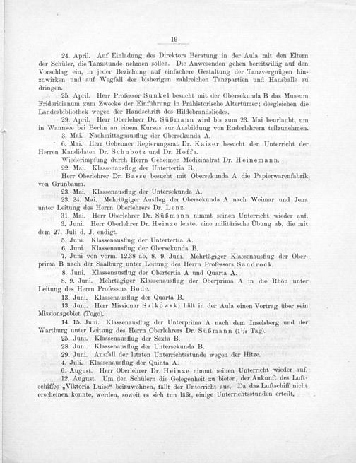 25. April. Herr Professor Sunkel besucht mit der Obersekunda B das Museum Fridericianum zum Zwecke der Einführung in Prähistorische Altertümer; desgleichen die Landesbibliothek wegen der Handschrift des Hildebrandsliedes.