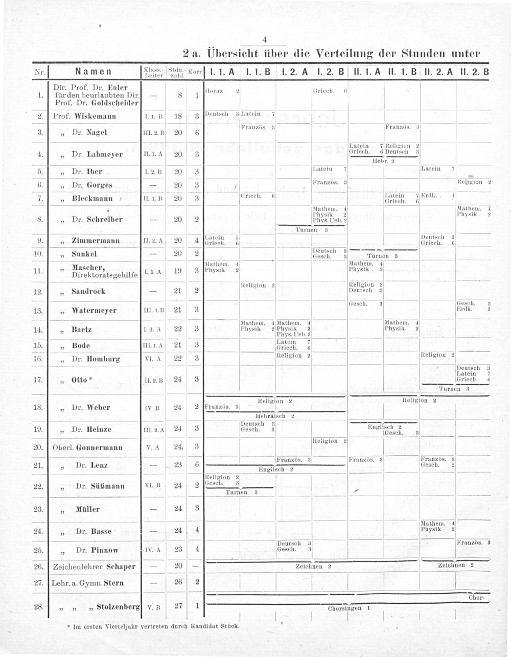 Nr. Namen Kiadae Sda Korr. let A I. 1.B I. 2. A 1. 2. B II. 1. A IHI. 1. B IHI. 2. A HI. 2. B Dir. Prof. Dr. Euler . 4 2. u. Horaz 2 Griech. 6 1. für den beurlaubten Dir.— 8 1 ee V Prof. Dr. Goldscheider . 2———— 3— 2. Prof. Wiskemann I. 1. B V 18 3. Deusseh A latein 7 ————————— Französ. 3 Französ. 3 3.„ Dr. Nagel III. 2. B 20 6 V 5—— e Latein 7 Rcligion 2 4.„ Dr. Lahmeyer II. 1. A 20 3 I Lco Veu aon* Hebr. 2 5.]„ Dr. Iber Le.. 20 3 V Latem. V Latein 7 6.„ Dr. Gorges—- 20 3. Ianehs 8 V nelsion 2 7.„ Bleckmann II. 1. H 20 3 ſeirison. 6 briech. ea ————— Mathem. 4—— Mathem. 4 . Physik 2 Physik 2 8.„ Dr. Schreiber— 20 2 Phys. LIeb. 2 Turnen 3— „f, y Latei 5—— Deutsch 3 55 9.„ Zimmermann I. 2. 4*20. 4. lain Gre— 2, 5 5 45 8 Feuisch 3.—— 10.„ Sunkel— 20 2 Gesch. 3 Turnen 3 ———-jae,— Mathem. 4 3 „ Mascher, 9 3 ſphysik 2 Physik 2 11. Direktoratsgehilfe 1.1rà 19 4 5 Religion 2 Religion ² 4 12.„ Sandrock— 21 2 Deutsch 1 V ——. 5 Gesch 3S desch. 2 13.„ Watermeyer III. 1. 5 21 3 Lrdk. 1 Mathem. 4 Mathem. 4 Mathem. 4 14. Baetz 1.2. A 22 3 Physik 2Physik 2 Physik 2 2 Phys. Ueb. 2 4 . 7 SI füten, V 15.„ Bode IILI. Aà 21 3 Griech. 6 — g⸗ 5 5 Religi Religion 2 16.„ Dr. Homburg VI. A 22 3 Religion 2 8 ——————— 8 Deutsch 3 . Latein 7 17.„ Otto* II. 2. 3 24 3 V I Griech. 6 Turnen 3 .. Religion 2 4 Religion 2 18.„ Dr. Weber IVB 24 2 Eranzös. 3 V Hebräisch 2 1.— — 5 Deutsch 3—— 19.„ Dr. Heinze III. 2. 4 24 3 Gesch. 3 4 3 Religion 2 20.] Oberl. Gonnermann Vv. A 24, 3 ———————— ——— Französ. 3 Französ. 3 Französ. 3 21. Dr. Len⸗z— 23 6— Gesch. 2 2 Englisch 2 — Religion 2 22.„ Dr. Süßzmann VI. B 24 2 Gesch. 3. äöLEAfrrnen 3 2— —. 1 23.„ Nüller- 24 3 ——— 8— Mathem. 4 1 24.„ Dr. Basse— 24 4 Physik 2 2 3„ 4 Deutsch 3 † 5 Französ. 3 25.„ Dr. Pinnow IV. A 23 4 desch. 3 ————QVQ—Q—— ˖˖ ͤO!—— 26.] Zeichenlehrer Schaper— 20— Zeichnen 2 lehnen 2 ——————,——————— 5 1 27.[Lehr. a. Gymn. Stern— 26 2 V V 5— Chor- 28.„„„ Stolzenberg v. B 27 1 Chorsingen 1 1