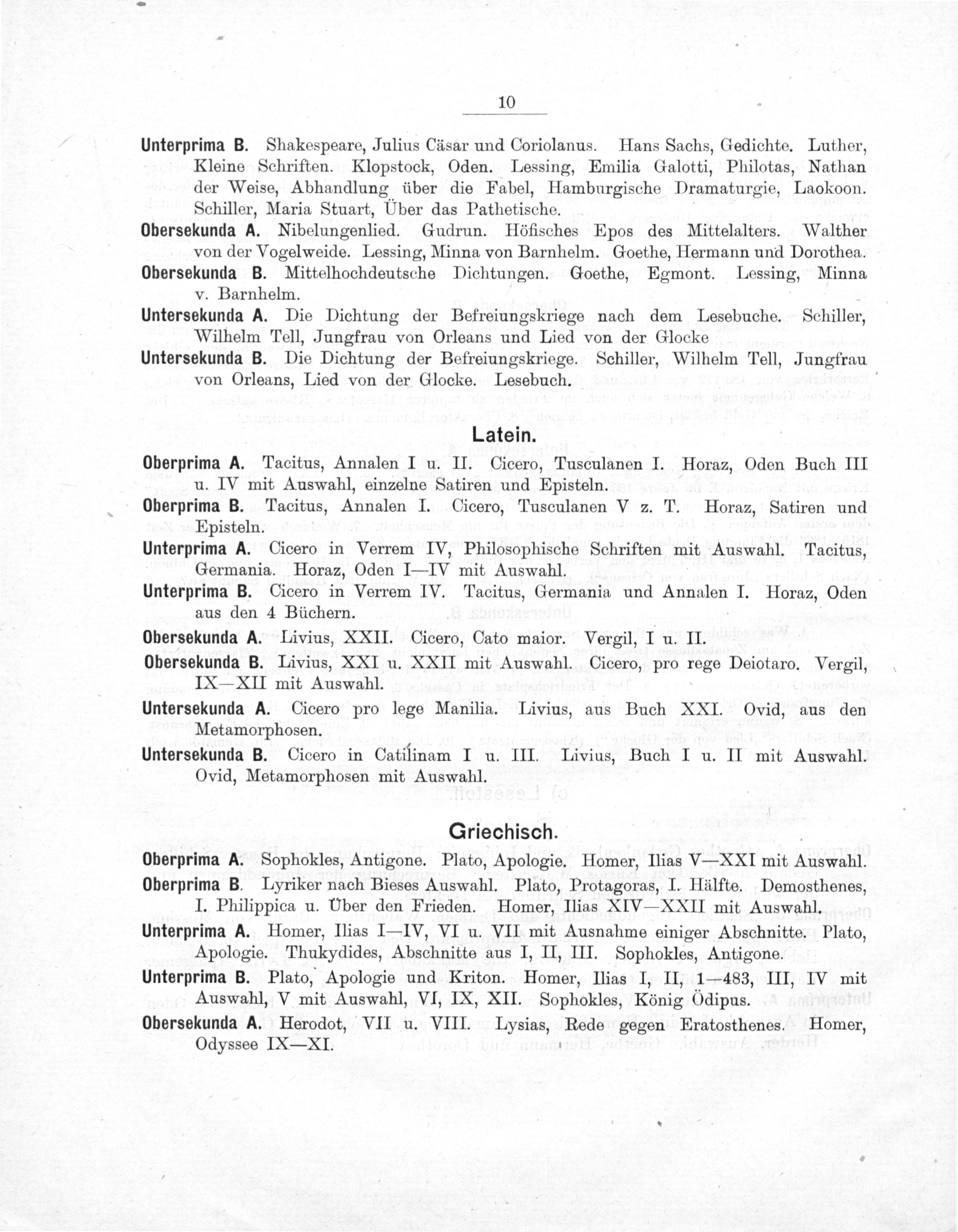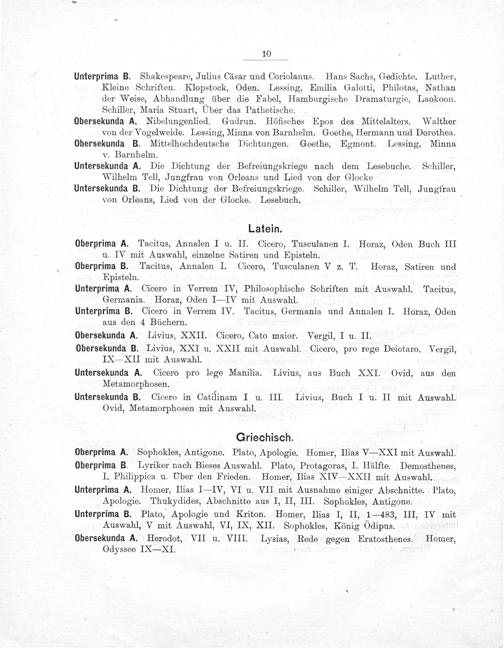 Unterprima B. Shakespeare, Julius Cäsar und Coriolanus. Hans Sachs, Gedichte. Luther, Kleine Schriften. Klopstock, Oden. Lessing, Emilia Galotti, Philotas, Nathan der Weise, Abhandlung über die Fabel, Hamburgische Dramaturgie, Laokoon. Schiller, Maria Stuart, UÜber das Pathetische.