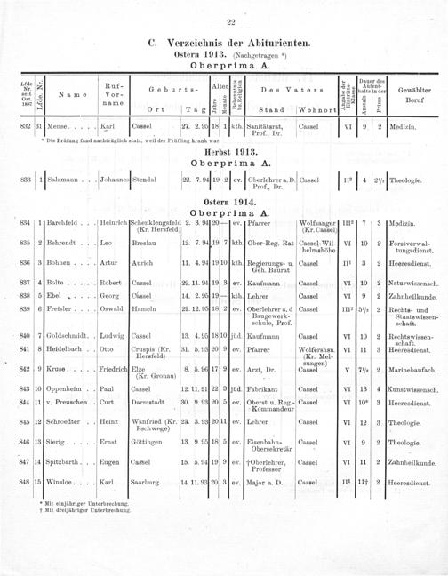 C. Verzeichnis der Abiturienten. Ostern 1913.(Nachgetragen*) Oberprima A. Lfde. 25 70 5 DAner 6s Nr. Ruf- Geburts- Alter 8 Des Vaters 25 naltsinder Gewühlter seit Name Vor- 215* A Ost. 2[2e 8,—S Beruf 1887 name 5[31/58 5. 3 Ort Tagſs 2[*2 Stand Wohnort 5 832 31 Mense..... Karl Cassel 27. 2. 95 18 1 kth.]Sanitätsrat, Cassel VI9 b 2[Medizin. r Prof., Dr. . * Die Prüfung fand nachträglich statt, weil der Prüfling krank war. 2 Herbst 1913. Oberprima A. 833 V 1 Salzmann... Johannes Stendal 22. 7. 4 19 2 er ſoperrunev Cassel Y 112 V 4 2¹ rhewse Prof., Dr. Ostern 1914. Oberprima A. 834 1 Barchfeld... Heinrich Schenklengsfeld 2. 3. 94 20,— ev.] Pfarrer Wolfsanger] III2 7 3[Medizin. (Kr. Hersfeld)(Kr. Cassel) 835 2 Behrendt... Leo Breslau 12. 7. 94 19 7 kth.] Ober-Reg. Rat Cassel-Wil- VI10 2 Forstverwal- helmshöhe tungsdienst. 836 3 Bohnen.... Artur Aurich 11. 4. 94 19 10 ſkth.] Regierungs- u. Cassel II3 2[(Heeresdienst. Geh. Baurat 837 4 Bolte..... Robert[Cassel 29. 11. 94 19 3 ſev. Kaufmann Cassel VI 10 2 Naturwissensch. 838 5 Ebel„... Georg Cassel 14. 2. 95] 19,— kth.] Lehrer Cassel VII9 2[Zahnheilkunde. 839 6 Freisler.... Oswald Hameln 29. 12.95 18 2 ev.[Oberlehrer a. d Cassel III2[5 ½ 2[Rechts- und Baugewerk- Staatswissen- schule, Prof. schaft. 840 7[Goldschmidt.. Ludwig[Cassel 13. 4. 95 18 10 jüd.] Kaufmann Cassel VI 10 2[(Rechtswissen- schaft. 841 8 Heidelbach.. Otto Cruspis(Kr. 31. 5. 93 20 9 ev. Pfarrer Wolfershsn. VI11 3(Heeresdienst. Hersfeld)(Kr. Mel- sungen) 842 9[Kruse..... Friedrich] Elze 8. 5. 96/ 17 9 ſev. Arzt, Dr. Cassel V[7 ½ 2[Marinebaufach. (Kr. Gronau) 843 10 OQppenheim.. Paul Cassel 12. 11. 9122 3 ſjüd.] Fabrikant Cassel VI 13 4 ſKunstwissensch. 844 11[v. Preuschen. Curt Darmstadt 30. 9. 93 20 5 ev. Oberst u. Reg.- Cassel VI[10 3[Heeresdienst. Kommandeur 845 12[Schroedter. Heinz Wanfried(Kr. 23. 3. 93 20 11 ev. Lehrer Cassel VI 12 3 Theologie. Eschwege) 846 13[Sierig..... Ernst Göttingen 13. 9. 95 18 5 ſev.] Eisenbahn- Cassel VI9 2 Theologie. Obersekretär 847 14[Spitzbarth... Eugen[Cassel 15. 5. 94 19 9 ſev.[†Oberlehrer, Cassel VI 11 2[Zahnheilkunde. Professor 848 15 Winsloe.... Karl Saarburg 14. 11. 93 20 3[ev. Major a. D. Cassel III[11 † 2[Heeresdienst.