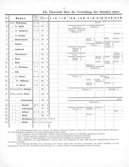 Der Verteilungsplan mußte seit Ausbruch des Krieges wiederholt geändert werden, teils wegen Einberufung einzelner Mitglieder des Lehrerkollegiums zum Heere, teils wegen Erkrankung einiger Herren. 1 Vom 9. Dezember ab bis Weihnachten vertreten wegen Krankheit durch die Kandidaten Bachmann und Heller. ² Am 1. Februar zum Heere einberufen; vertreten durch die Kandidaten Bachmann und Heller.