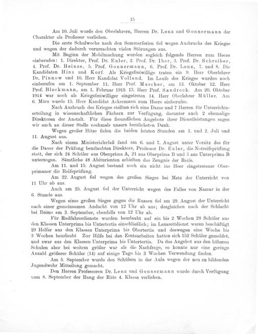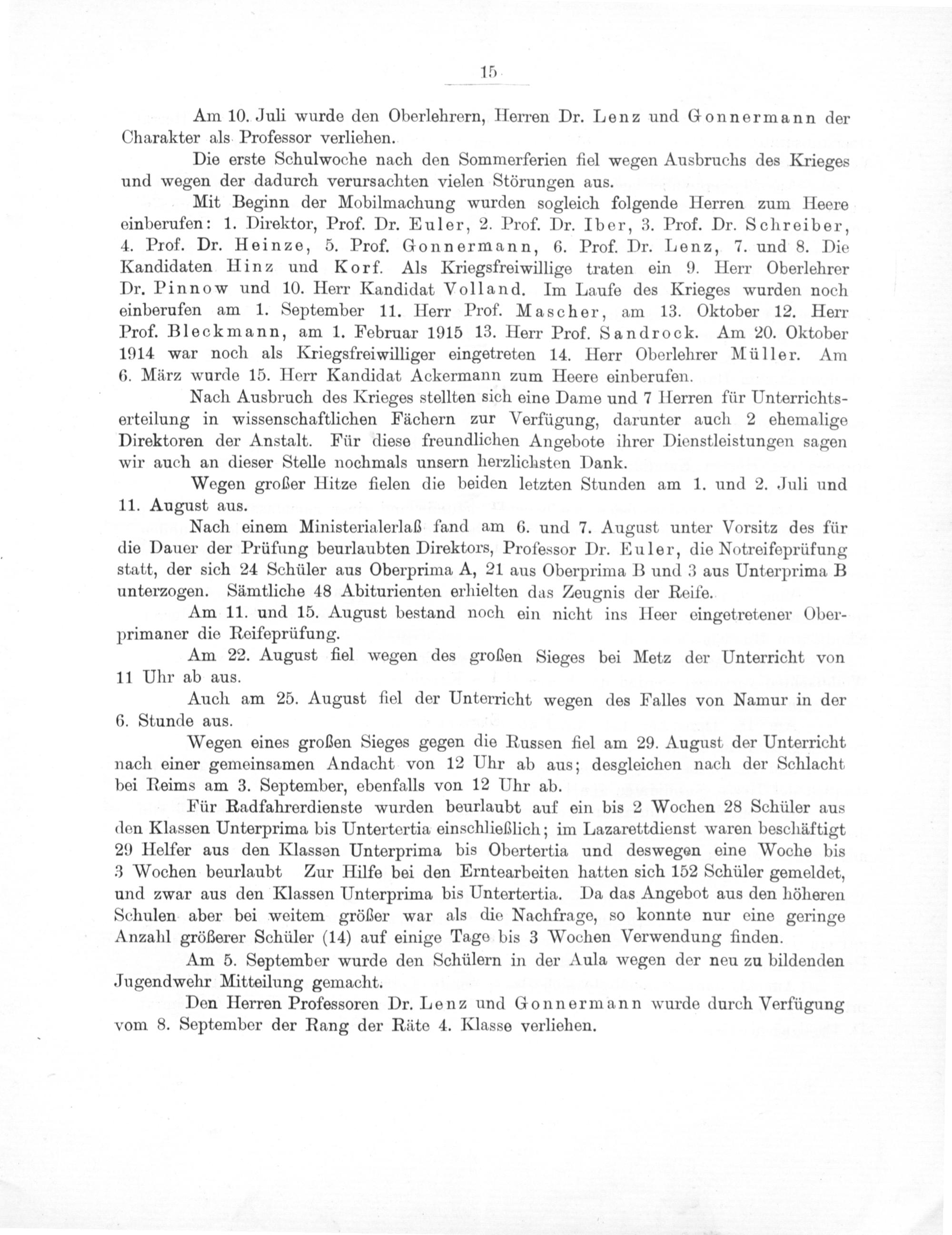 Mit Beginn der Mobilmachung wurden sogleich folgende Herren zum Heere einberufen: 1. Direktor, Prof. Dr. Euler, 2. Prof. Dr. Iber, 3. Prof. Dr. Schreiber, 4. Prof. Dr. Heinze, 5. Prof. Gonnermann, 6. Prof. Dr. Lenz, 7. und 8. Die Kandidaten Hinz und Korf. Als Kriegsfreiwillige traten ein 9. Herr Oberlehrer Dr. Pinnow und 10. Herr Kandidat Volland. Im Laufe des Krieges wurden noch einberufen am 1. September 11. Herr Prof. Mascher, am 13. Oktober 12. Herr Prof. Bleckmann, am 1. Februar 1915 13. Herr Prof. Sandrock. Am 20. Oktober 1914 war noch als Kriegsfreiwilliger eingetreten 14. Herr Oberlehrer Müller. Am 6. März wurde 15. Herr Kandidat Ackermann zum Heere einberufen.