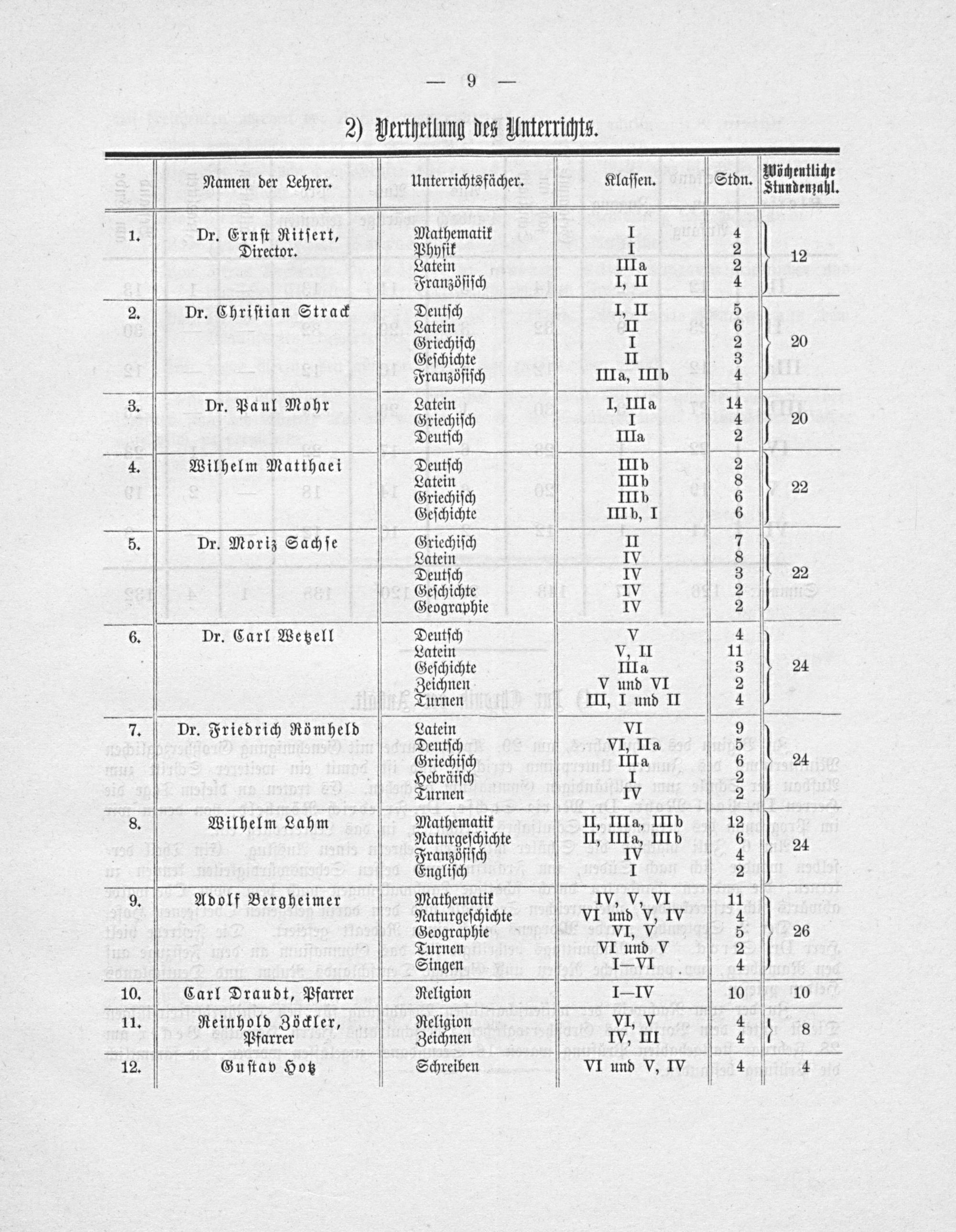 ———— n gi⸗ Namen der Lehrer. Unterrichtsfächer. Klaſſen. Stdn. Autennl 1. Dr. Ernſt Ritſert, Mathematik I 4 Director. Phyſik 1 3 12 Latein IIIa 2 Franzöſiſch 1) II 4 2. Dr. Chriſtian Strack Deutſch I, II 5 Latein II 6 Griechiſch I 2 20 Geſchichte II 3 Franzöſiſch IIIa, IIIb 4 3. Dr. Paul Mohr Latein I, IIIa 14 Griechiſch I 4 20 Deutſch IIIa 2 4. Wilhelm Matthaei Deutſch IIIb 2 Latein IIIb 8 22 Griechiſch IIIb 6 Geſchichte IIIb, I 6 5. Dr. Moriz Sachſe Griechiſch II 7 Latein IV 8 Deutſch IV 3 22 Geſchichte IV 2 Geographie IV— 2 6 Dr. Carl Wetzell Deutſch V* Latein V, II 11 Geſchichte IIIa 3 24 Zeichnen V und VI 2 Turnen III, I und II 4 7. Dr. Friedrich Römheld Latein VI 9 Deutſch VI, IIa 5 Griechiſch IIIa 6 24 Hebräiſch 1 2 Turnen IV 2 8. Wilhelm Lahm Mathematik II, IIIa, IIIb 12 Naturgeſchichte II, IIIa, IIIb 6 24 Franzöſiſch IV 4 Engliſch I 2 9. Adolf Bergheimer Mathematik IV, V, VI 11 Naturgeſchichte VI und V, IV 4 Geographie VI, V 5 26 Turnen VI und V 2 Singen I— VI 4 10. Carl Draudt, Pfarrer Religion I—IV 10 10 11. Reinhold Zöckler, Religion VI, V 4 8 Pfarrer Zeichnen IV, III 4 1 12. Guſtav Hotz Schreiben VI und V, IV 4