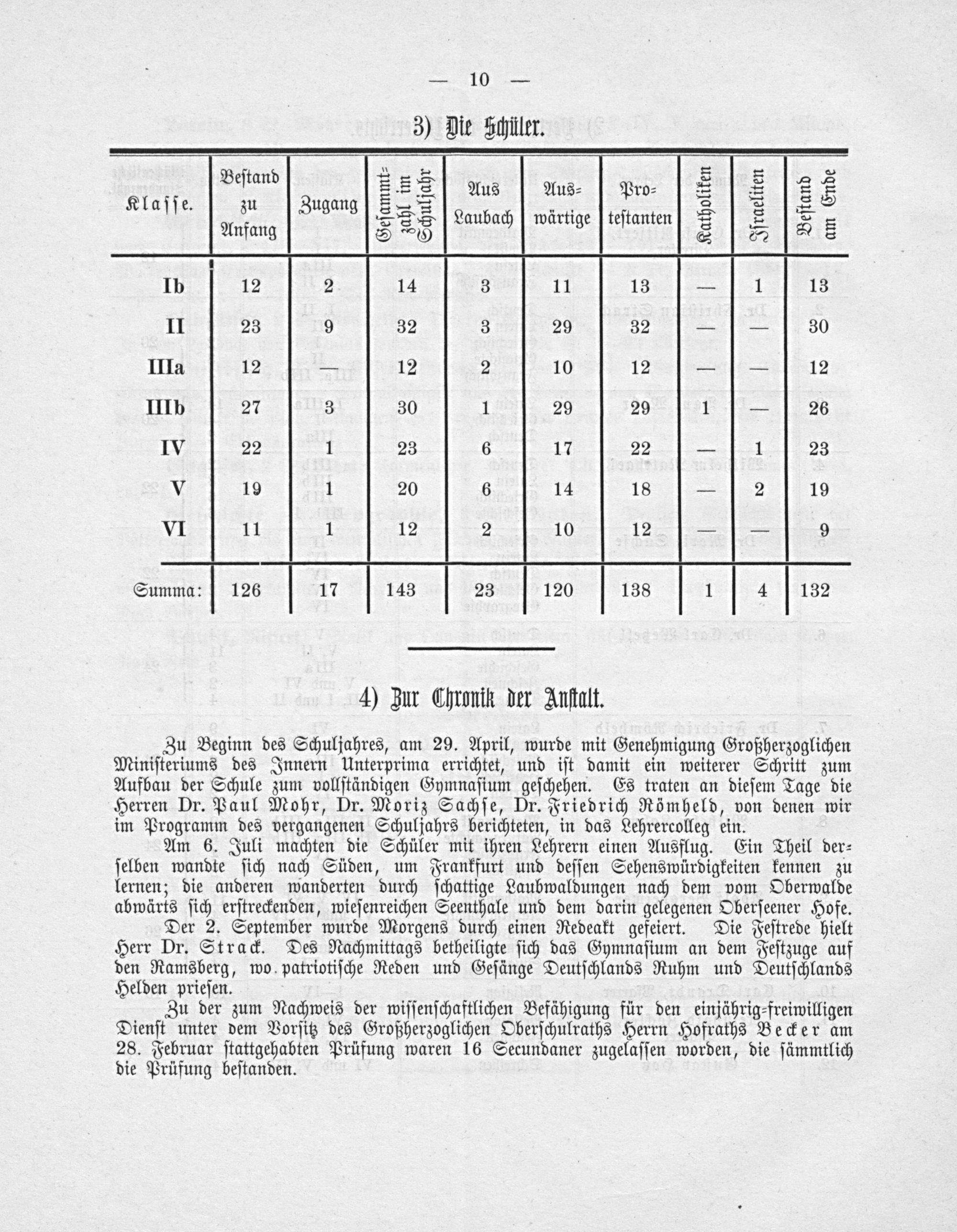 Zu Beginn des Schuljahres, am 29. April, wurde mit Genehmigung Großherzoglichen Miniſteriums des Innern Unterprima errichtet, und iſt damit ein weiterer Schritt zum Aufbau der Schule zum vollſtändigen Gymnaſium geſchehen. Es traten an dieſem Tage die Herren Dr. Paul Mohr, Dr. Moriz Sachſe, Dr. Friedrich Römheld, von denen wir im Programm des vergangenen Schuljahrs berichteten, in das Lehrercolleg ein.