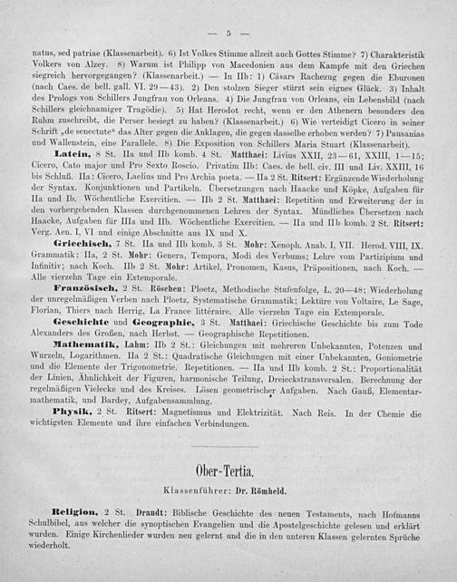 natus, sed patriae(Klassenarbeit). 6) Ist Volkes Stimme allzeit auch Gottes Stimme? 7) Charakteristik Volkers von Alzey. 8) Warum ist Philipp von Macedonien aus dem Kampfe mit den Griechen siegreich hervorgegangen?(Klassenarbeit.)— In IIb: 1) Cäsars Rachezug gegen die Eburonen (nach Caes. de bell. gall. VI. 29— 43). 2) Den stolzen Sieger stürzt sein eignes Glück. 3) Inhalt des Prologs von Schillers Jungfrau von Orleans. 4) Die Jungfrau von Orleans, ein Lebensbild(nach Schillers gleichnamiger Tragödie). 5) Hat Herodot recht, wenn er den Athenern besonders den Ruhm zuschreibt, die Perser besiegt zu haben?(Klassenarbeit.) 6) Wie verteidigt Cicero in seiner Schrift„de senectute“ das Alter gegen die Anklagen, die gegen dasselbe erhoben werden? 7) Pausanias und Wallenstein, eine Parallele. 8) Die Exposition von Schillers Maria Stuart(Klassenarbeit). Latein, 8 St. Ila und IIb komb. 4 St. Matthaei: Livius XXII, 23— 61, XXIII, 1— 15; Cicero, Cato major und Pro Sexto Roscio. Privatim IIb: Caes. de bell. civ. III und Liv. XXIII, 16