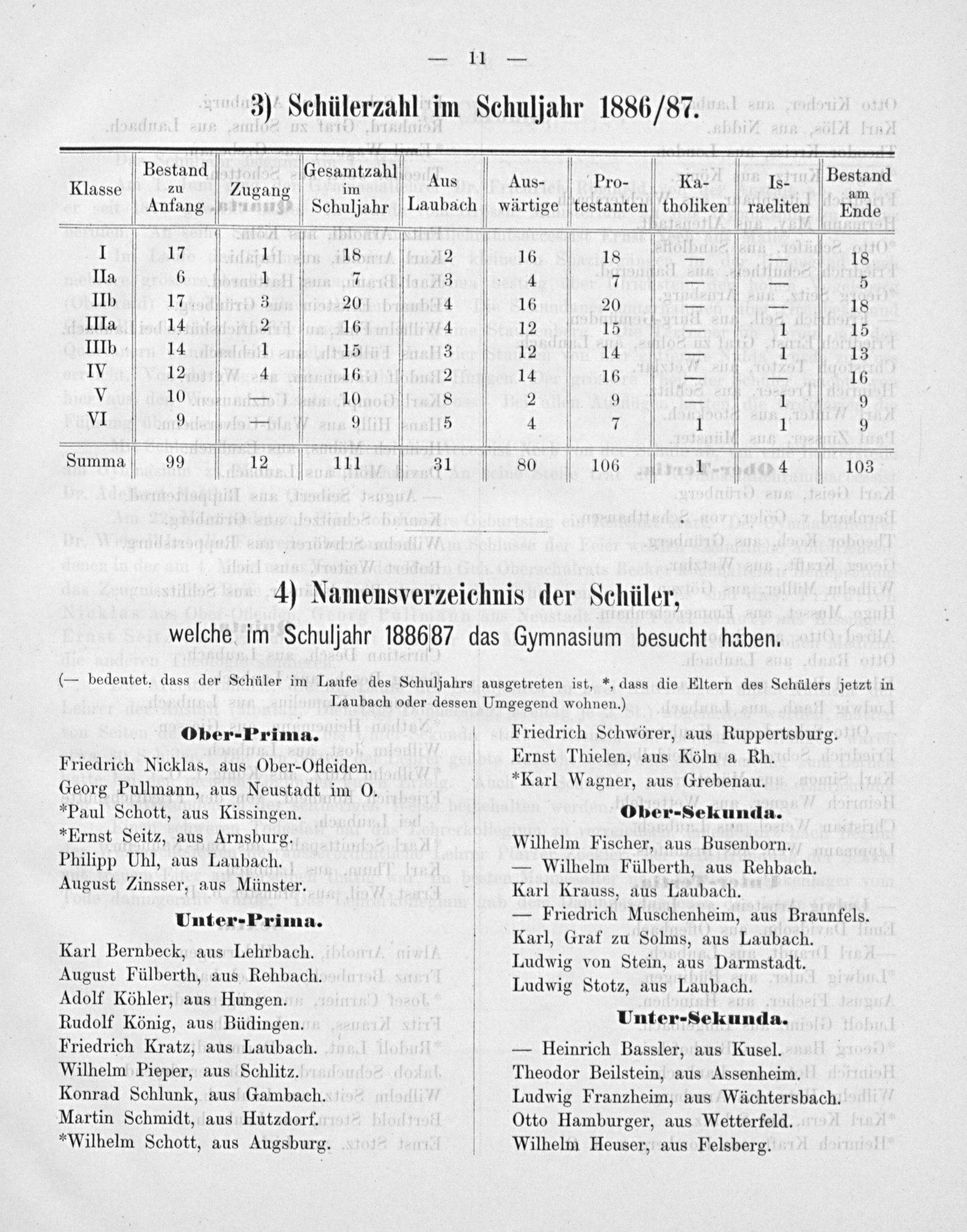 Rudolf König, aus Büdingen. Unter-Sekunda. Friedrich Kratz, aus Laubach.— Heinrich Bassler, aus Kusel. Wilhelm Pieper, aus Schlitz. Theodor Beilstein, aus Assenheim. Konrad Schlunk, aus Gambach. Ludwig Franzheim, aus Wächtersbach. Martin Schmidt, aus Hutzdorf. Otto Hamburger, aus Wetterfeld. *Wilhelm Schott, aus Augsburg. Wilhelm Heuser, aus Felsberg.