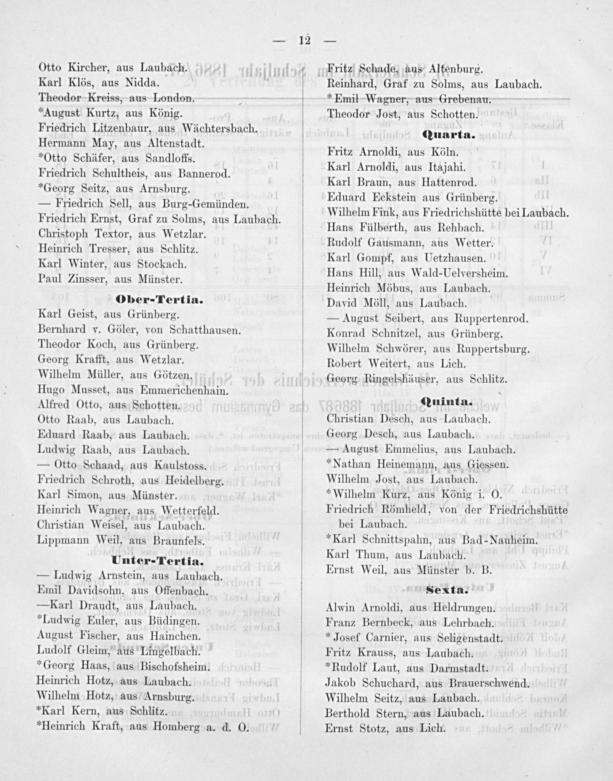 Quinta. Christian Desch, aus Laubach. Georg Desch, aus Laubach. — August Emmelius, aus Laubach. *Nathan Heinemann, aus Giessen. Wilhelm Jost, aus Laubach. *Wilhelm Kurz, aus König i. O. Friedrich Römheld, von der Friedrichshütte