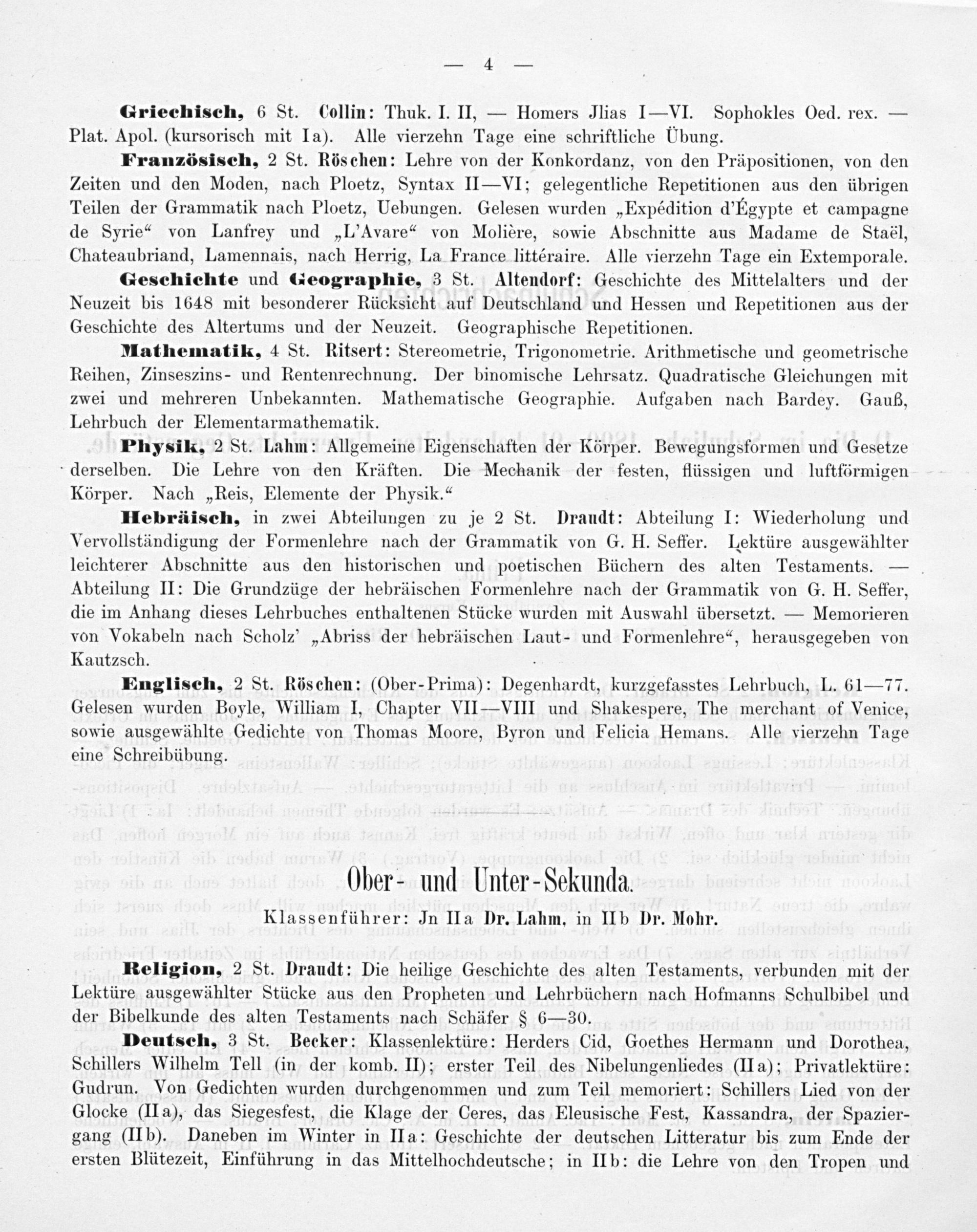 Deutsch, 3 St. Becker: Klassenlektüre: Herders Cid, Goethes Hermann und Dorothea, Schillers Wilhelm Tell(in der komb. II); erster Teil des Nibelungenliedes(IIa); Privatlektüre: Gudrun. Von Gedichten wurden durchgenommen und zum Teil memoriert: Schillers Lied von der Glocke(II a), das Siegesfest, die Klage der Ceres, das Eleusische Fest, Kassandra, der Spazier- gang(IIb). Daneben im Winter in IIa: Geschichte der deutschen Litteratur bis zum Ende der ersten Blütezeit, Einführung in das Mittelhochdeutsche; in IIb: die Lehre von den Tropen und