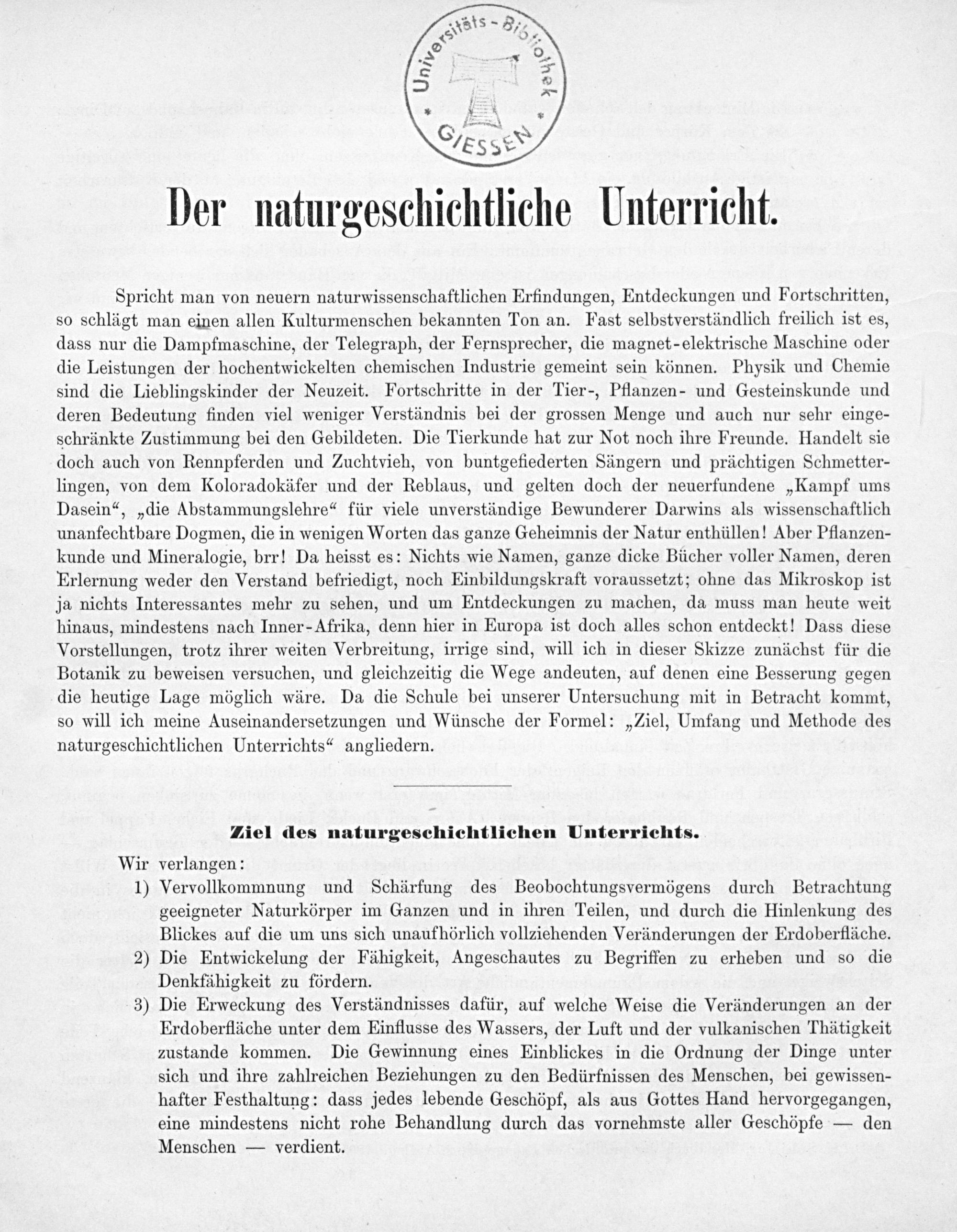 Spricht man von neuern naturwissenschaftlichen Erfindungen, Entdeckungen und Fortschritten, so schlägt man einen allen Kulturmenschen bekannten Ton an. Fast selbstverständlich freilich ist es, dass nur die Dampfmaschine, der Telegraph, der Fernsprecher, die magnet-elektrische Maschine oder die Leistungen der hochentwickelten chemischen Industrie gemeint sein können. Physik und Chemie sind die Lieblingskinder der Neuzeit. Fortschritte in der Tier-, Pflanzen- und Gesteinskunde und deren Bedeutung finden viel weniger Verständnis bei der grossen Menge und auch nur sehr einge- schränkte Zustimmung bei den Gebildeten. Die Tierkunde hat zur Not noch ihre Freunde. Handelt sie doch auch von Rennpferden und Zuchtvieh, von buntgefiederten Sängern und prächtigen Schmetter- lingen, von dem Koloradokäfer und der Reblaus, und gelten doch der neuerfundene„Kampf ums Dasein“,„die Abstammungslehre“ für viele unverständige Bewunderer Darwins als wissenschaftlich unanfechtbare Dogmen, die in wenigen Worten das ganze Geheimnis der Natur enthüllen! Aber Pflanzen- kunde und Mineralogie, brr! Da heisst es: Nichts wie Namen, ganze dicke Bücher voller Namen, deren Erlernung weder den Verstand befriedigt, noch Einbildungskraft voraussetzt; ohne das Mikroskop ist ja nichts Interessantes mehr zu sehen, und um Entdeckungen zu machen, da muss man heute vweit hinaus, mindestens nach Inner-Afrika, denn hier in Europa ist doch alles schon entdeckt! Dass diese Vorstellungen, trotz ihrer weiten Verbreitung, irrige sind, will ich in dieser Skizze zunächst für die Botanik zu beweisen versuchen, und gleichzeitig die Wege andeuten, auf denen eine Besserung gegen die heutige Lage möglich wäre. Da die Schule bei unserer Untersuchung mit in Betracht kommt, so will ich meine Auseinandersetzungen und Wünsche der Formel:„Ziel, Umfang und Methode des naturgeschichtlichen Unterrichts“ angliedern.