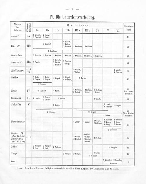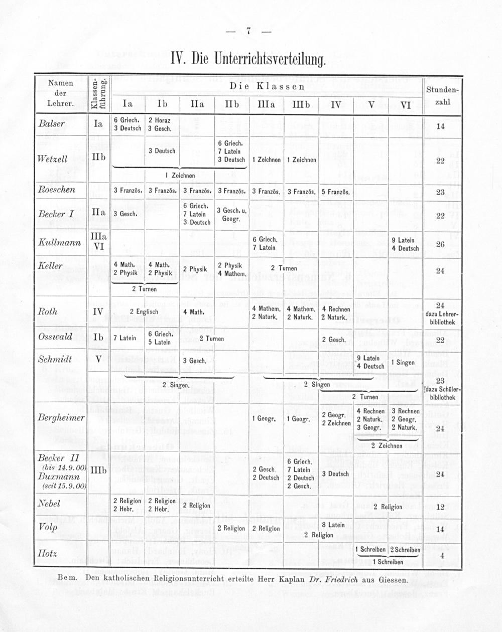 1 3 Die Klassen Stunden- er 4 Lehrer. ◻1☛☛ Ila Ib IIa IIb Illa IIIb IV V VI zahl A 6 Griech. 2 Horaz Balser la 3 Deutsch 3 Gesch. 14 6 Griech. 3 Deutsch 7 Latein Welxell IIb 3 Deutsch 1 Zeichnen 1 Zeichnen 22 1 Zeichnen Foeschen 3 Französ. 3 Französ, 3 Französ. 3 Französ. 3 Französ. 3 Französ. 5 Französ. 23 “ 6 Griech. 3 Gesch Pecker I IIa 3 Gesch. 7 Latein Od u. 22 3 Deutsch gr. IIIa 6 Gclech. 9 Latein Kullmann VI 7 Latein 4 beutsch 26 Reller 4 Math. 4 Math. 4 2 Physik 2 T 2 Physk 2 Physk 2 Physik 4 Mathem. Lrnen 24 2 Turnen ———— Sasd But— 9 4 Mathem. 4 Mathem. 4 Rechnen Rolh Iv 2 Engisch 4 Math. 2 Naturk. 2 Naturk. 2 Naturk. 329 Lohrer- bibliothek Osswald Ib 7 Latein 5 eſe 2 Turnen 2 Gesch. 22 6,,.9 Latein 5 ¹ 5* Schmidt V 3 Gesch. 4 Dautsch 1 Singen 2 Singen 23 2 Singen. L(dazu Schöler- 2 Turnen bibliothek V 2 Geogr 4 Rechnen 3 Rechnen Bergheimer 1 Geogr. 1 Geogr. 2 2epren 2 Naturk. 2 Geogr. 3 Geogr. 2 Naturk. 24 2 Zeichnen Becher II 6 Griech. (bis 14.9. 00) IIIb 2 Gesch. 7 Latein PDugmann 2 Deutsch 2 Deutsch 3 beutsch 24 (seit 15. 9. 00) 2 Gesch. Nebel 3 neen V 5 haltſan 2 Rellgion 2 Rellgion 12 ————— S1nen.—— 01 2 Rteligion 2 Rellgion 14 4 2 34 4 2 Religion —“ 3 1 Schreiben 2 Schreiben 4 Hola 1 Schrelben