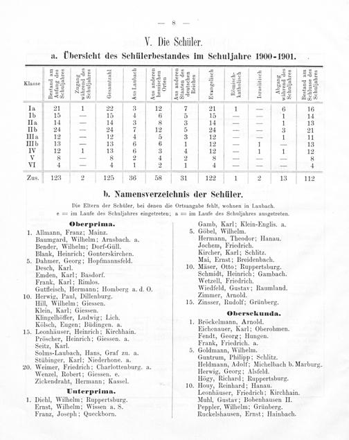 a. Ubersicht des Schülerbestandes im Schuljahre 1900-1901. 3,³ ⁸½ 42 2 8[22[23 5 3 2 333 ½ 8 5 80 E S S 3 2 5 25 2 2 28 5 8 2 8 ·8☛ 8 Klasse 2 22 52 8* ·55 354 5 2 52 28 2 5 14[276[25 45 27— E 2553 82S 5 5 2 3 2* 2 10 2 82 5=5 S 8= S 4 2 55* A 3 2 85 Ia 21 1 22 3 12 7 21— 6 16 Ib 15— 15 4 6 5 15— 1 14 IIa 14— 14 3 8 3 14—— 1 13 IIb 24— 24 7 12 5 24—— 3 21 IIIa 12— 12 4 5 3 12—— 1 11 IIIb 13— 13 6 6 1 12— 1— 13 IV 12 1 13 6 3 4 12— 1 1 12 V 8— 8 2 4 2 8——— 8 VI 4— 4 1 2 1 4——— 4 Lus. 1231 2 125 36 7536 3l 122 1 2 13 112 b. Namensverzeichnis der Schüler. Die Eltern der Schüler, bei denen die Ortsangabe fehlt, wohnen in Laubach. e= im Laufe des Schuljahres eingetreten; a= im Laufe des Schuljahres ausgetreten. Oberprima. Gamb, Karl; Klein-Englis. a. 1. Allmann, Franz; Mainz. 5. Göbel, Wilhelm. Baumgard, Wilhelm; Arnsbach. a. Hermann, Theodor Hanau. Bender, Wilhelm; Dorf-Güll. Jochem, Friedrich. Blank, Heinrich; Gonterskirchen. Kircher, Karl; Schlitz. 5. Dahmer, Georg; Hopfmannsfeld. Mai, Ernst; Breidenbach. Desch, Karl. 10. Mäser, Otto; Ruppertsburg. Emden, Karl; Basdorf. Schmidt, Heinrich; Gambach. Frank, Karl; Rimlos. Wetzell, Friedrich. Gutfleisch, Hermann; Homberg a. d. O. Wiedfeld, Gustav; Raumland. 10. Herwig, Paul, Dillenburg. Zimmer, Arnold. Hill, Wilhelm; Giessen. 15. Zinsser, Rudolf; Grünberg. Klein, Karl; Giessen. Klingelhöffer, Ludwig; Lich. Lhersekumela. Kölsch, Eugen; Büdingen. a. 1. Bröckelmann, Arnold. 15. Leonhäuser, Heinrich; Kirchhain. Eichenauer, Karl; Oberohmen. Pröscher, Heinrich; Giessen. a. Fendt, Georg; Hungen. Seitz, Karl. 4 Frank, Friedrich. a. Solms-Laubach, Hans, Graf zu. a. 5. Goldmann, Wilhelm.: Stübinger, Karl; Niederhone. a. Guntrum, Thilipp; Schlitz. 20. Weimer, Friedrich; Charlottenburg. a. Heldmann, Adolt; Michelbach b. Marburg. Wenzel, Robert; Giessen. e. Herwig; Georg; Alsfeld. Zickendraht, Hermann; Kassel. Högy, Richard; Ruppertsburg. 1 10. Houy, Reinhard; Hanau. Unterprima. Leonhäuser, Friedrich; Kirchhain. 1. Diehl, Wilhelm; Ruppertsburg. Muhl, Gustav; Bobenhausen II. Ernst, Wilhelm; Wissen a. S. Peppler, Wilhelm; Grünberg.
