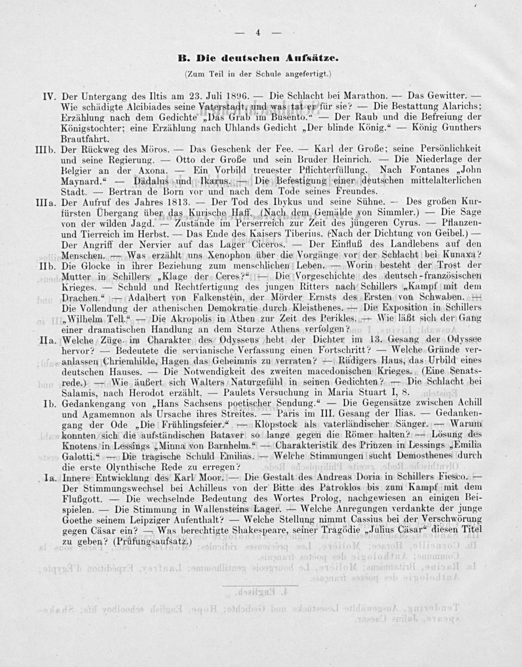Innere Entwicklung des Karl Moor.— Die Gestalt des Andreas Doria in Schillers Fiesco.— Der Stimmungswechsel bei Achilleus von der Bitte des Patroklos bis zum Kampf mit dem Flußgott.— Die wechselnde Bedeutung des Wortes Prolog, nachgewiesen an einigen Bei- spielen.— Die Stimmung in Wallensteins Lager.— Welche Anregungen verdankte der junge Goethe seinem Leipziger Autfenthalt?— Welche Stellung nimmt Cassius bei der Verschwörung gegen Cäsar ein?— Was berechtigte Shakespeare, seiner Tragödie„Julius Cäsar“ diesen Titel zu geben?(Prüfungsaufsatz.)