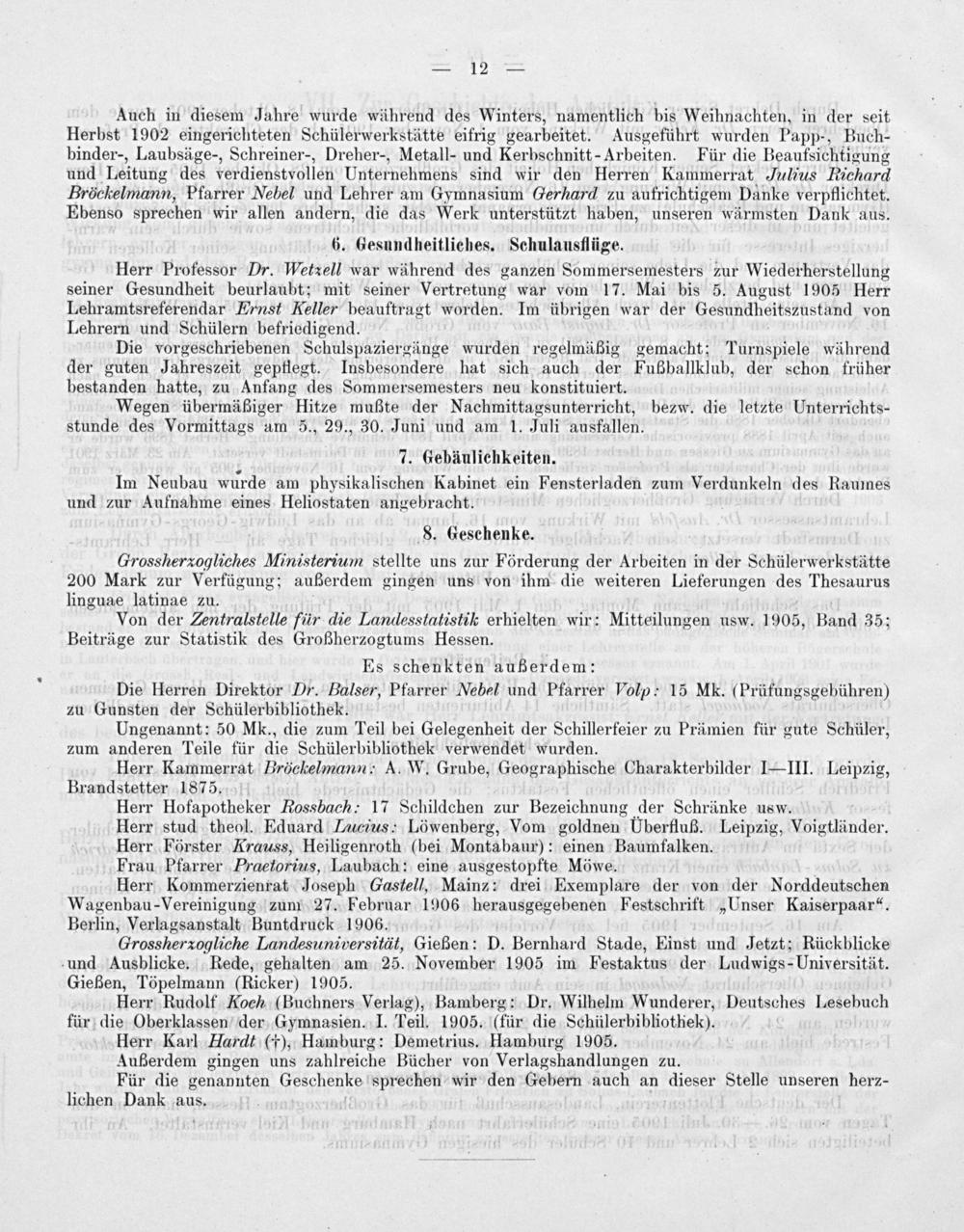 Herr Professor Dr. Wetzell war während des ganzen Sommersemesters zur Wiederherstellung seiner Gesundheit beurlaubt; mit seiner Vertretung war vom 17. Mai bis 5. August 1905 Herr Lehramtsreferendar Ernst Keller beauftragt worden. Im übrigen war der Gesundheitszustand von Lehrern und Schülern befriedigend.