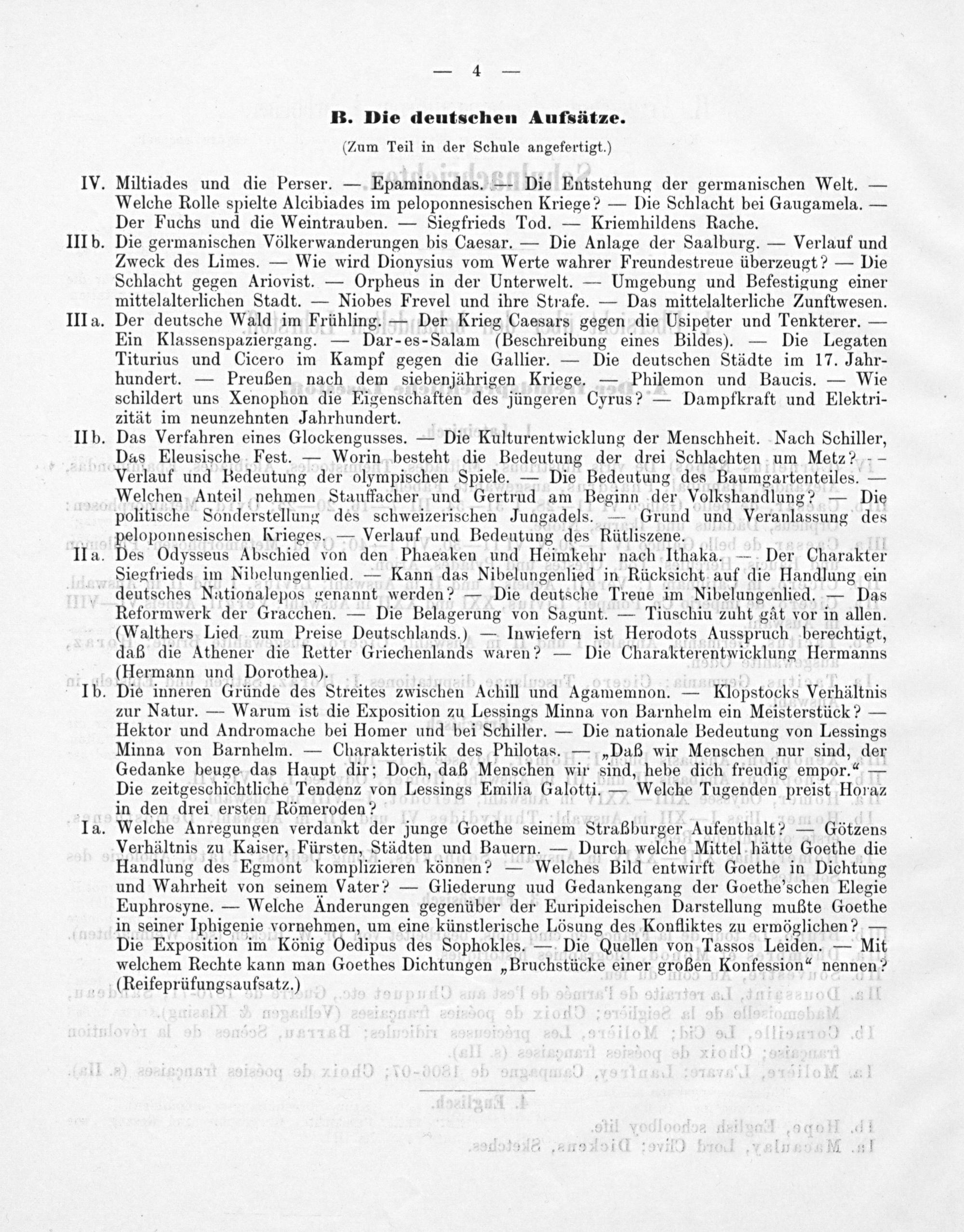 Das Verfahren eines Glockengusses.— Die Kulturentwicklung der Menschheit. Nach Schiller, Das Eleusische Fest.— Worin besteht die Bedeutung der drei Schlachten um Metz?— Verlauf und Bedeutung der olympischen Spiele.— Die Bedeutung des Baumgartenteiles.— Welchen Anteil nehmen Stauffacher und Gertrud am Beginn der Volkshandlung?— Die politische Sonderstellung des schweizerischen Jungadels.— Grund und Veranlassung des peloponnesischen Krieges.— Verlauf und Bedeutung des Rütliszene. es Odysseus Abschied von den Phaeaken und Heimkehr nach Ithaka.— Der Charakter Siegfrieds im Nibelungenlied.— Kann das Nibelungenlied in Rücksicht auf die Handlung ein deutsches Nationalepos genannt werden?— Die deutsche Treue im Nibelungenlied.— Das Reformwerk der Gracchen.— Die Belagerung von Sagunt.— Tiuschiu zuht gaàt vor in allen. (Walthers Lied zum Preise Deutschlands.)— Inwiefern ist Herodots Ausspruch berechtigt, daß die Athener die Retter Griechenlands waren?— Die Charakterentwicklung Hermanns (Hermann und Dorothea).