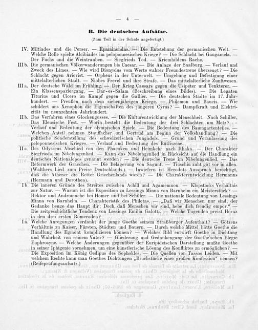 Die germanischen Völkerwanderungen bis Caesar.— Die Anlage der Saalburg.— Verlauf und Zweck des Limes.— Wie wird Dionysius vom Werte wahrer Freundestreue überzeugt?— Die Schlacht gegen Ariovist.— Orpheus in der Unterwelt.— Umgebung und Befestigung einer mittelalterlichen Stadt.— Niobes Frevel und ihre Strafe.— Das mittelalterliche Zunftwesen. Der deutsche Wald im Frühling.— Der Krieg Caesars gegen die Usipeter und Tenkterer.— Ein Klassenspaziergang.— Dar-es-Salam(Beschreibung eines Bildes).— Die Legaten Titurius und Cicero im Kampf gegen die Gallier.— Die deutschen Städte im 17. Jahr- hundert.— Preußen nach dem siebenjährigen Kriege.— Philemon und Baucis.— Wie schildert uns Xenophon die Eigenschaften des jüngeren Cyrus?— Dampfkraft und Elektri- zität im neunzehnten Jahrhundert.