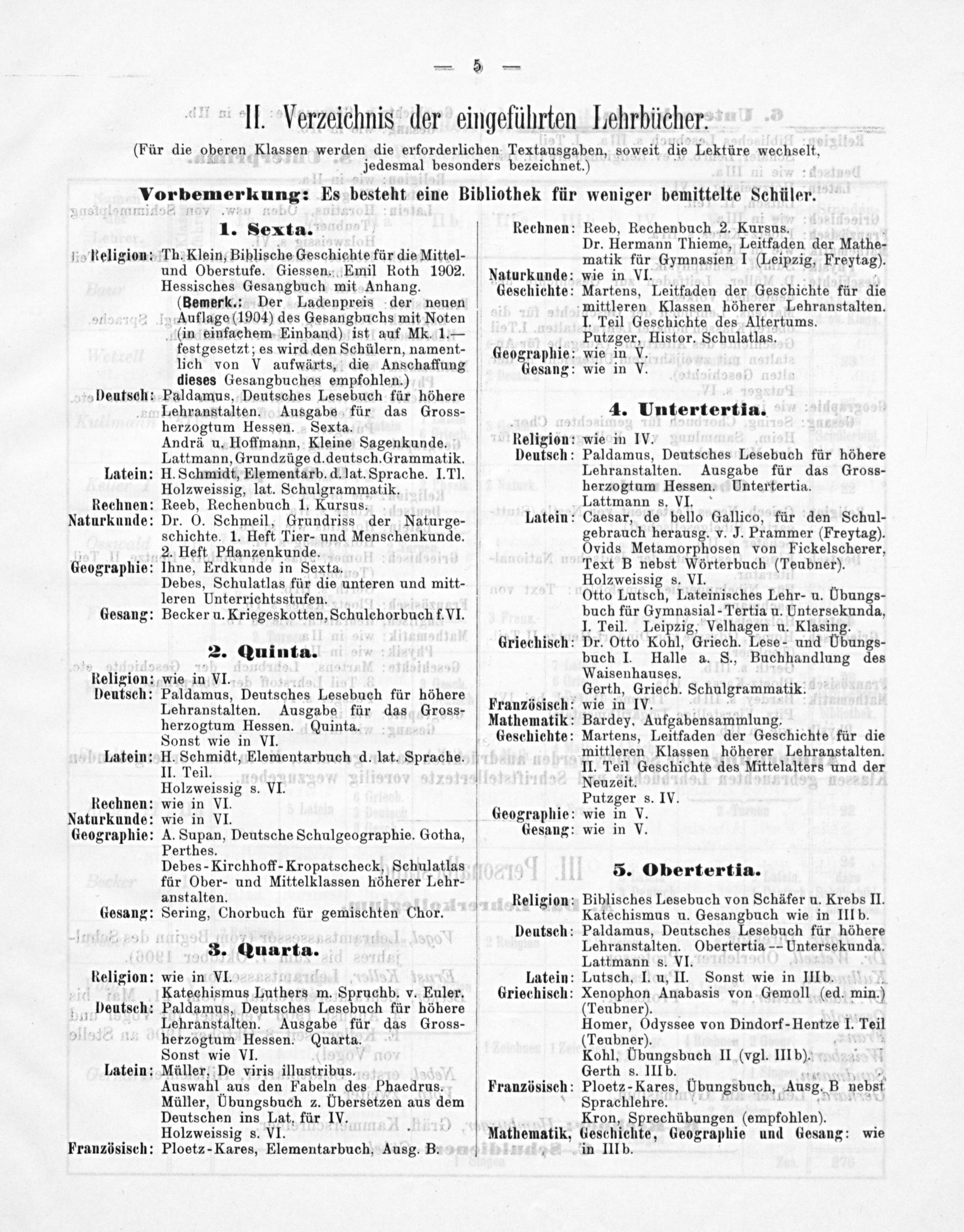 Biblisches Lesebuch von Schäfer u. Krebs II. Katechismus u. Gesangbuch wie in IIIb. Paldamus, Deutsches Lesebuch für höhere Lehranstalten. Obertertia- Untersekunda. Lattmann s. VI.
