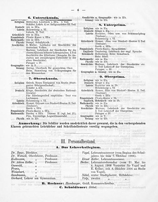 Lehramtsassessor(vom Beginn des Schul- jahres bis zum 7. Oktober 1906). Keller, Lehramtsassessor. Lehramtsreferendar(vom 21. Mai bis 4. August 1906 Vertreter für Vogel und E. Keller; seit 8. Oktober 1906 an Stelle von Vogel).