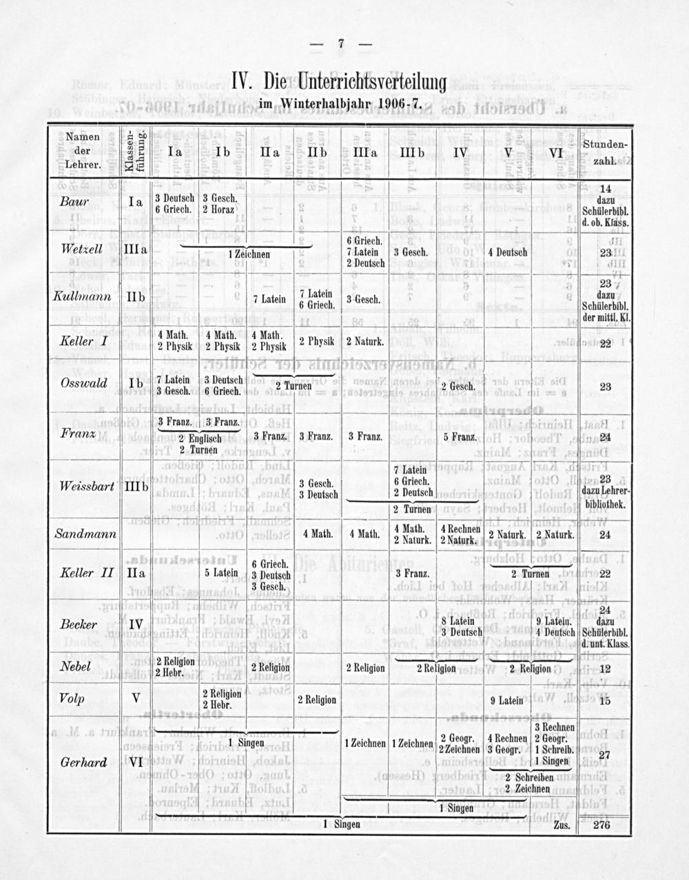 Namem 3 5. Stunden- der 3 5 Ia Ib II a II b III a III b IV V VI hl Lehrer. S V— zahl. Deutsch] 3 Gesch 2 . 3 Deutsc esch. dazu Baui Ia 6 Griech. 2 Horaz Schülerbibl. 1 d. ob. Kläss. 6 Griech. 111 Wetaell IIIa 1Zalchnen 7 Latein 3 Gesch. 4 Deutsch 231 2 Deutsch aAII 23, „ 7 Latein dazu Kullmann IIb 7 Latein 6 Griech. 3 Gesch. Schülerbibl. der mittl. kl. 4 Math. 4 Math. 4 Math. 3 1 Keller I 2 Physic 2 Physkk 2 Physk 2 Physik 2 Naturk. 22 3——. Osswald Ib 7 lateh 3 deneh 2 Turnen 2 Gesch. 23 3 Fraus 3 Pranz. an Franæ 2 Fnglisch 3 Franz. 3 Franz. 3 Franz. 5 Franz. 24 2 Turnen 1 7 bäen i. 23 . 6 Griech. 1. Weissbart IIIb 1 ahe 2 heutseh dazu Lehrer- 2urnen dſbſlek. 4 Math. 4 Rechnen.„» Sandmann 4 Nath. 4 Math. Naturk. 2 Naturk. ² Naturk. 2 Naturk. 24 . 66 Griech. Keller I IIa 5 Latein 3 Deutsch 3 Franz. 2 Turnen 22 . 3 Gesch. 7I 79 1 24 8 Latein 9 Latein. dazu Becker IV 3 Deutsch 4 Deutsch Schülerbibl. d. unt. Klass. Nebel 3 Nejhion 2 Religion 2 Religion 2 Religion 2 Religion 12 yo¹ V 2 Religion* 4 4 p 2 Uebr. 2 Religion 9 Latein 15 1— Fech Shechnen d. 2 Geogr. 4 Rechnen] 2 Geogr. 1 Singen 1 Zeichnen 1 Zeichnen Leiehnen 3 Geogr. 1 Sehreid. 2, Gerhard VI 1 Singen 2 Schreiben 2 Leichnen 2 1 Singen 21 3 1 Singen Zus. 276