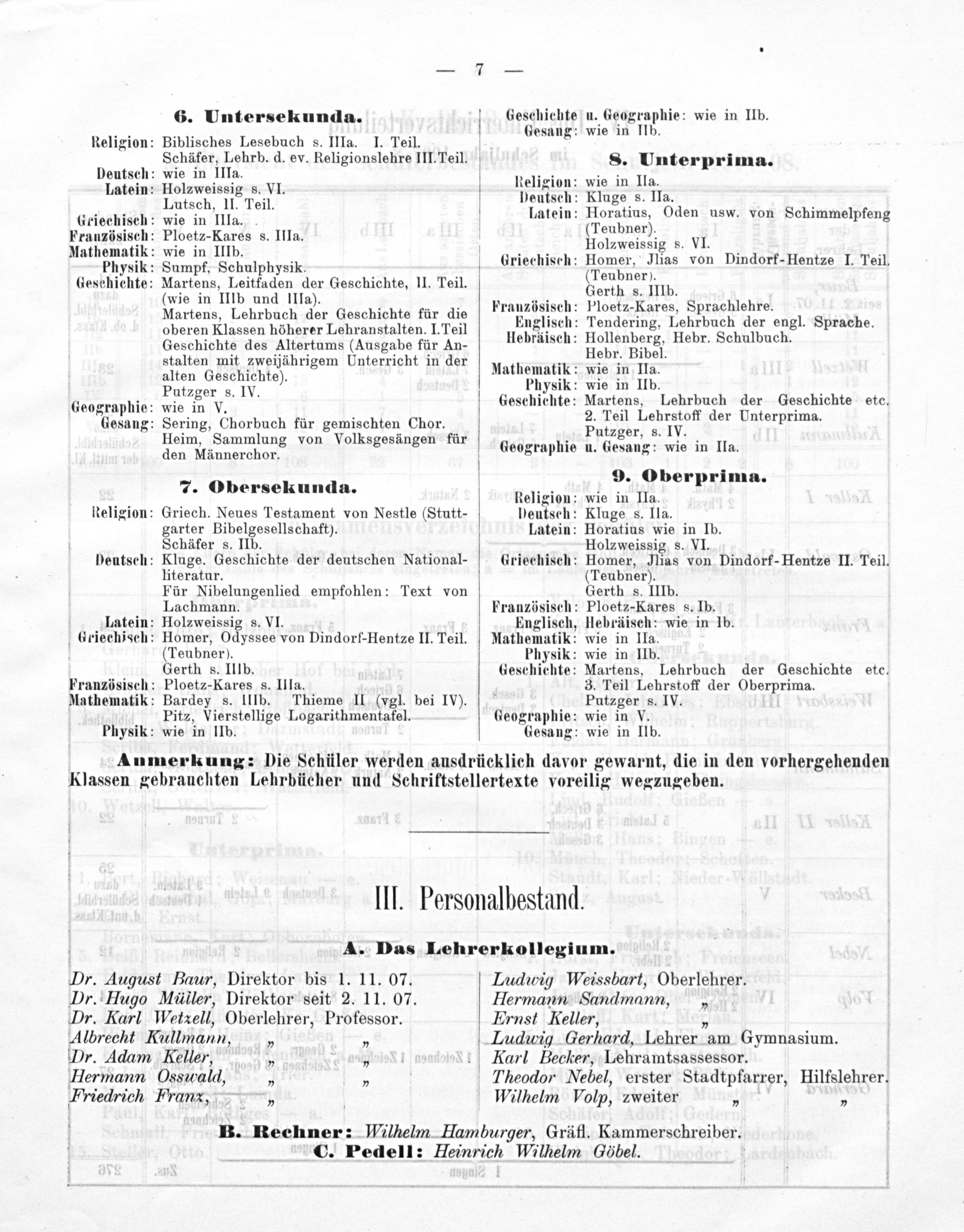 p⸗ August Baur, Direktor bis 1. 11. 07. Dr. Hugo Mäller, Direktor seit 2. 11. 07. Dr. Karl Wy'etaell, Oberlehrer, Professor. Albrecht Kullmann, 3