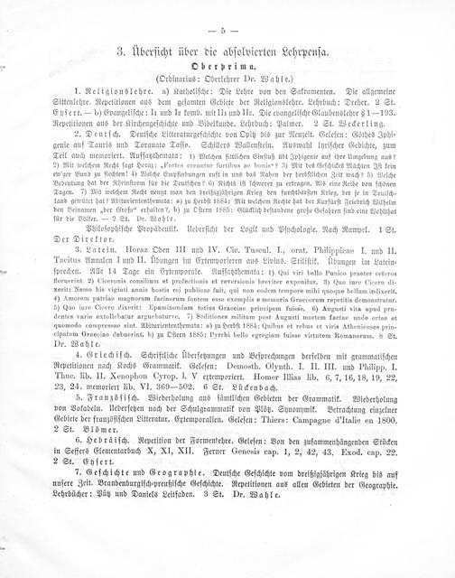 2. Deutſch. Deutſche Litteraturgeſchichte von Opitz bis zur Neuzeit. Geleſen: Göthes Iphi⸗ genie auf Tauris und Torquato Taſſo. Schillers Wallenſtein. Auswahl lyriſcher Gedichte, zum Teil auch memoriert. Aufſatzthemata: 1¹) Welchen ſittlichen Einfluß übt Iphigenie auf ihre Umgebung aus? 2) Mit welchem Recht ſagt Horaz:„Fortes creantur fortibus ac bonis“? 3) Mit des Geſchickes Mächten Iſt kein ew'ger Bund zu flechten! 4) Welche Empfindungen ruft in uns das Nahen der herbſtlichen Zeit wach? 5) Welche Bedeutung hat der Rheinſtrom für die Deutſchen? 6) Nichts iſt ſchwerer zu ertragen, Als eine Reihe von ſchönen Tagen. 7) Mit welchem Recht nennt man den dreißigjährigen Krieg den furchtbarſten Krieg, der je in Deutſch⸗ land gewütet hat? Abituriententhemata: a) zu Herbſt 1884: Mit welchem Rechte hat der Kurfürſt Friedrich Wilhelm den Beinamen„der Große“ erhalten?, b) zu Oſtern 1885: Glücklich beſtandene große Gefahren ſind eine Wohlthat für die Völker.— 2 St. Dr. Wahle.